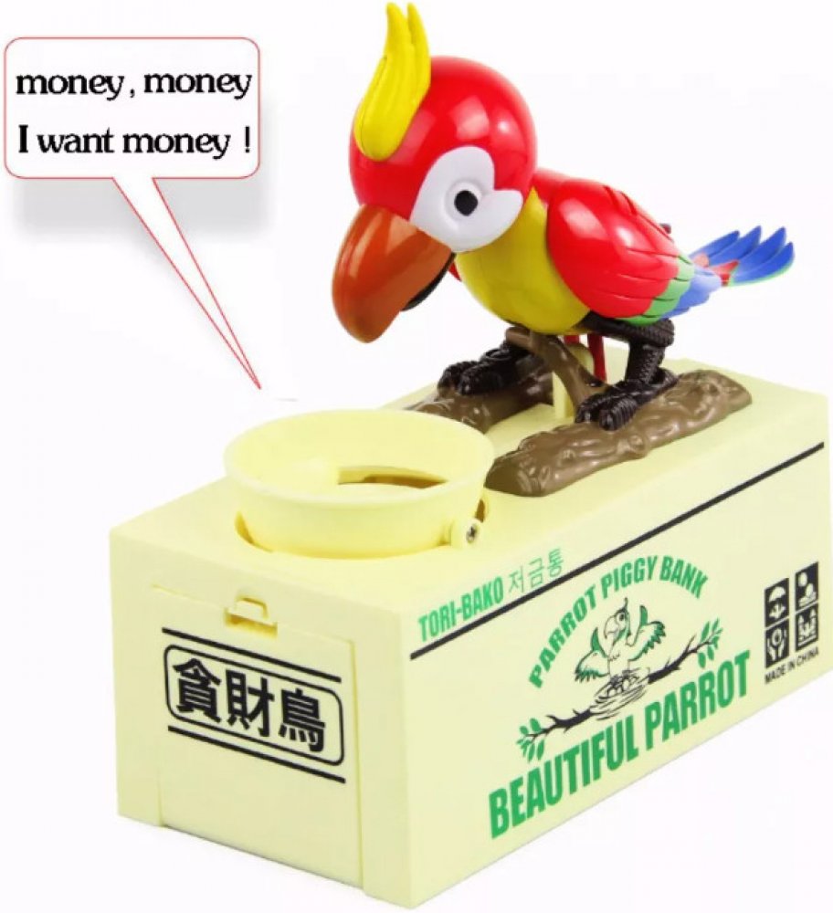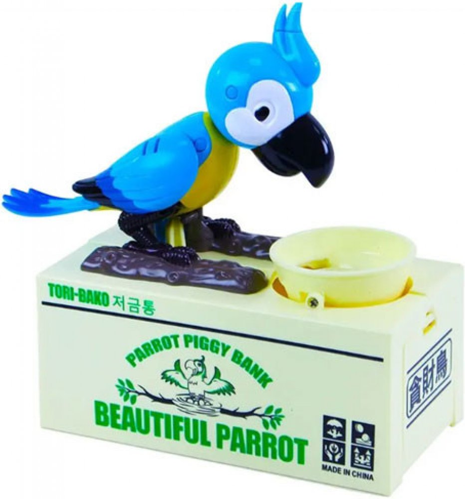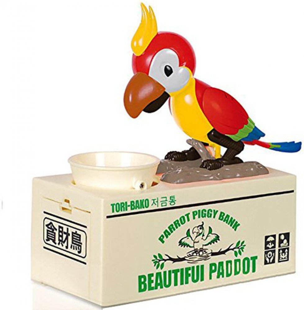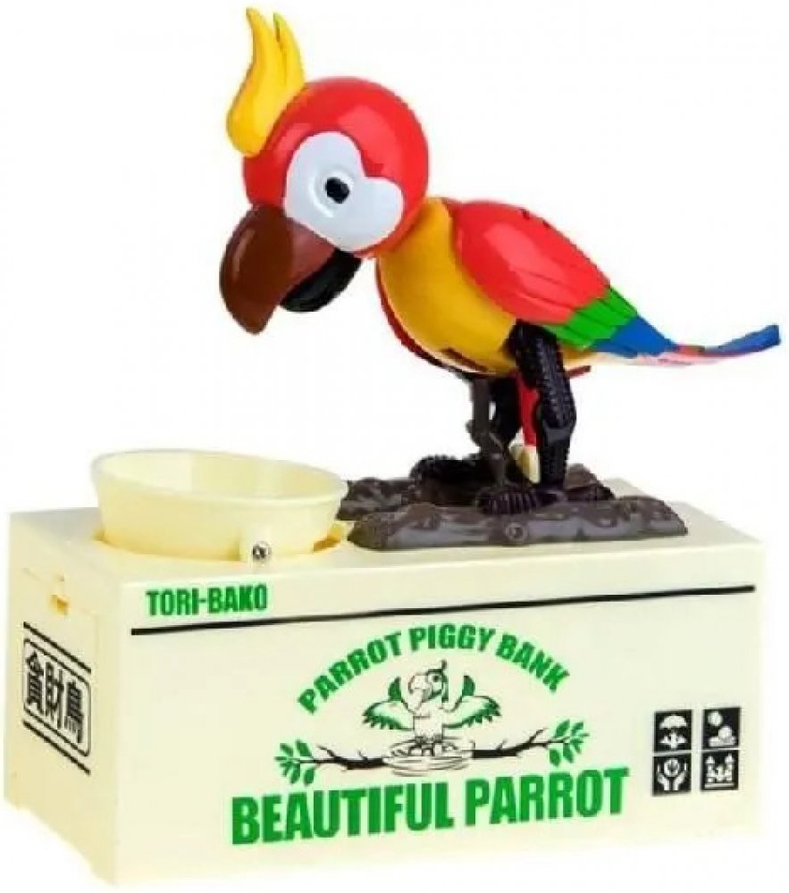 Pokladnička, kam bude děti bavit ukládat další a další penízky. Po vložení mince do misky se papoušek šťastně rozhýbe a začne "zobat" mince z misky. Svým vrtěním kováky natřese do misky tak, aby propadly do spodního úložného prostoru této kouzelné a originální pokladničky!