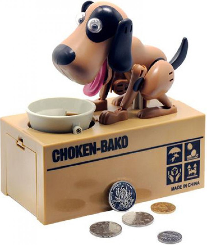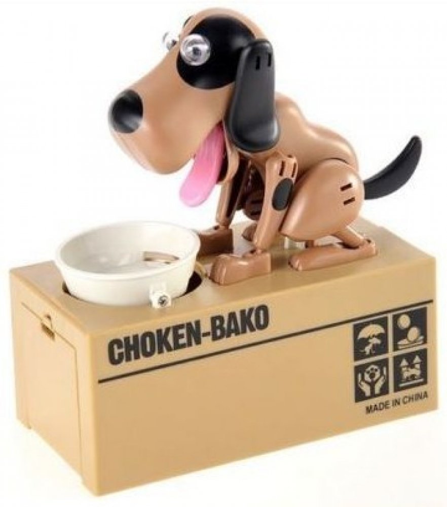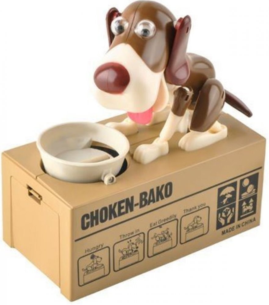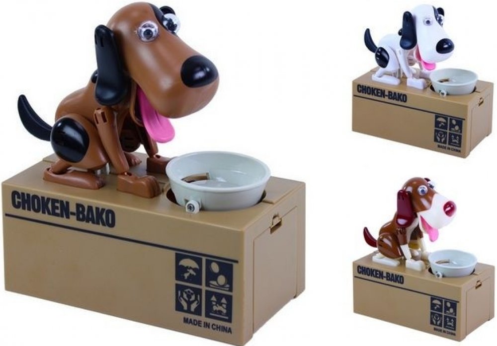 Pokladnička na mince – hladový pes si získala srdce dětí i dospělých po celém světě. Stačí jen vhodit mince do misky a pejsek se dá hned do pohybu. Minci v mžiku sní a u toho vám ještě stihne předvést pořádné psí kusy. Mince ale neskončí u něj v bříšku. Peníze propadnou do kasičky pod ním a miska zůstane prázdná. Pejsek je spokojený a připravený na další krmení.