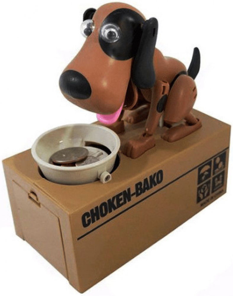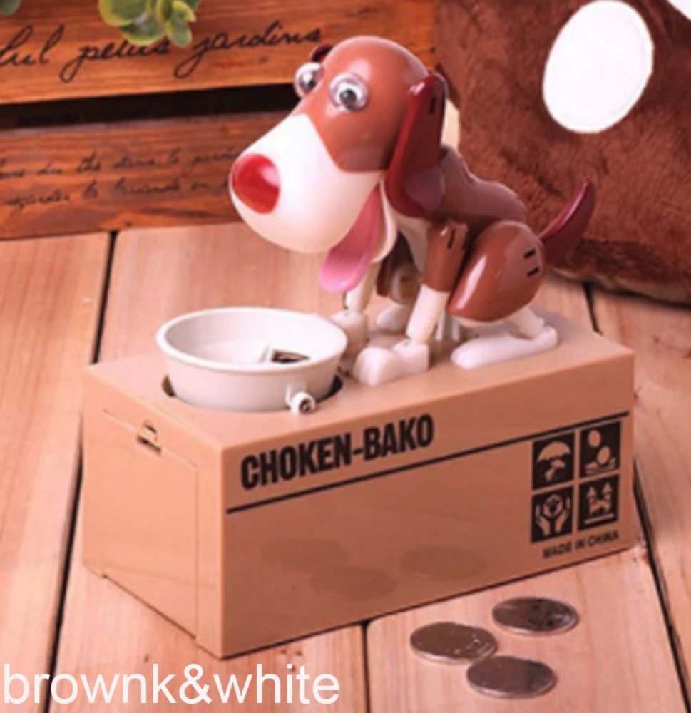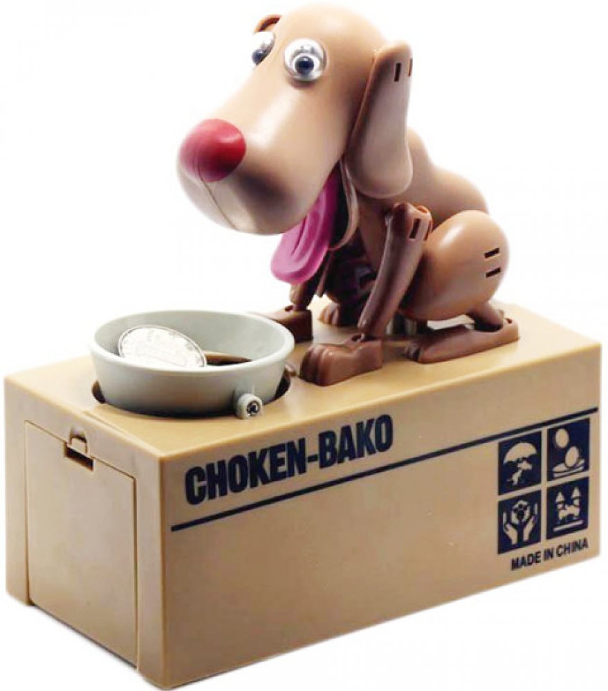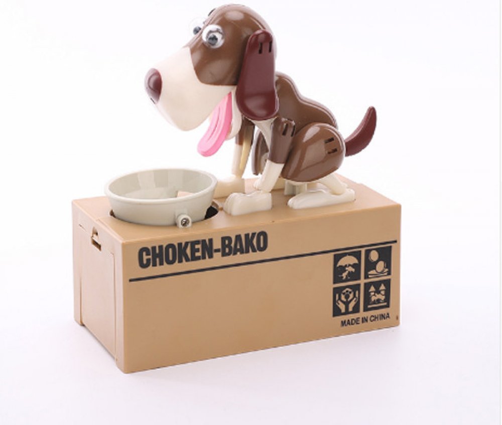 Pokladnička na mince – hladový pes si získala srdce dětí i dospělých po celém světě. Stačí jen vhodit mince do misky a pejsek se dá hned do pohybu. Minci v mžiku sní a u toho vám ještě stihne předvést pořádné psí kusy. Mince ale neskončí u něj v bříšku. Peníze propadnou do kasičky pod ním a miska zůstane prázdná. Pejsek je spokojený a připravený na další krmení.