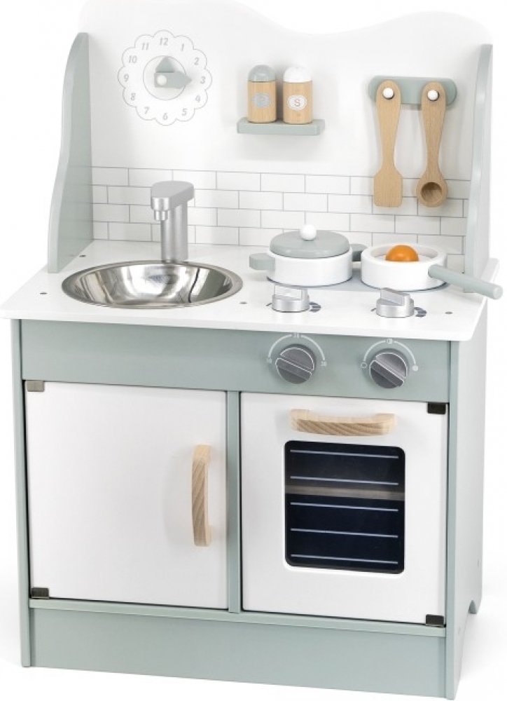 Společná příprava jídel se pro děti stane zábavnou, při které se naučí mnohé věci ze světa dospělých zábavnou formou - prostřednictvím hry. Dětská kuchyňka je vybavená pečící troubu a sporák s varnými plotnami, zabudovaným dřezem na nádobí, skříňkou na nádobí, hodinami a dalšími doplňky nezbytnými pro hru v kuchyňce - dřevěným nádobím, kuchařským náčiním a kořenkami.
