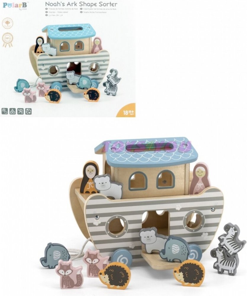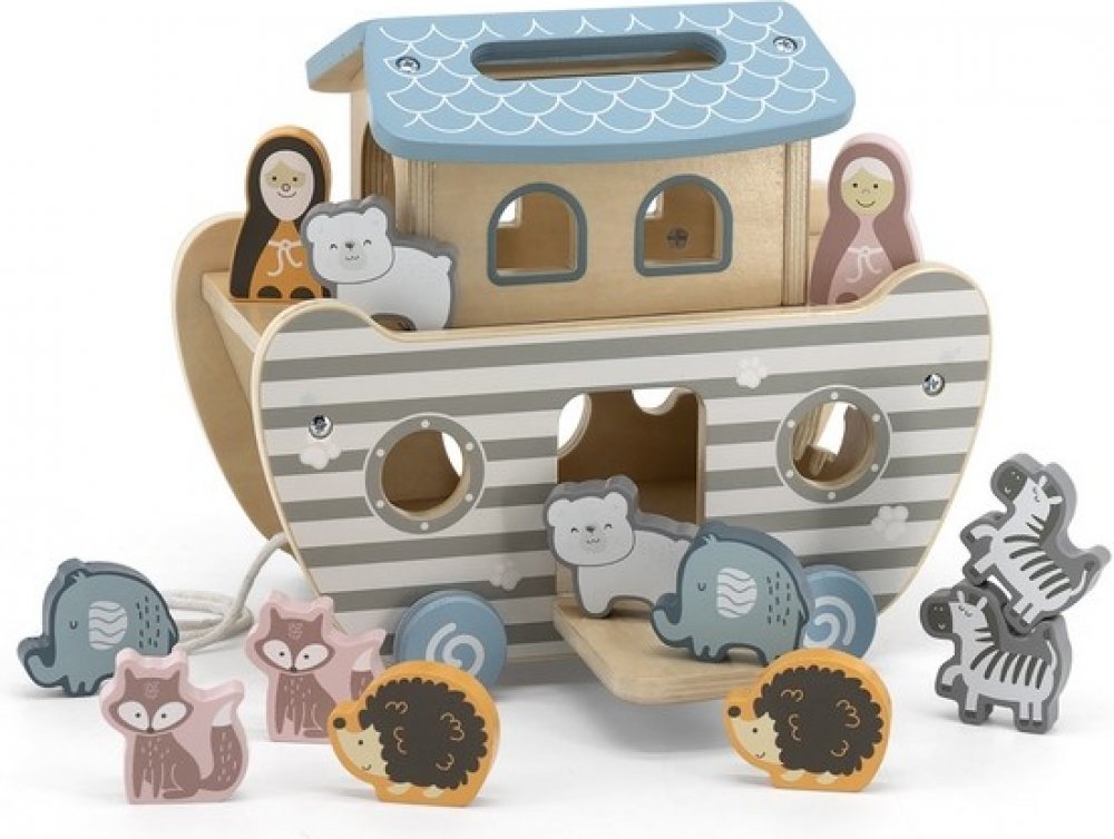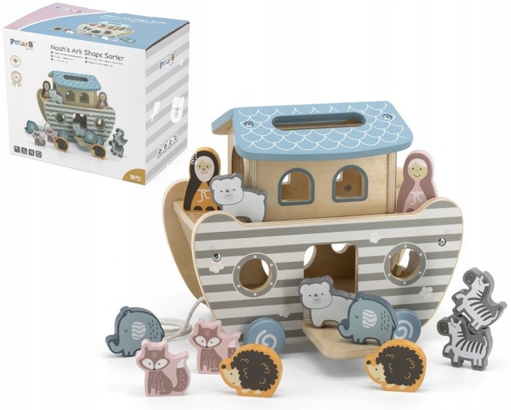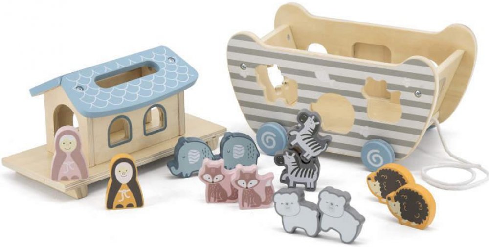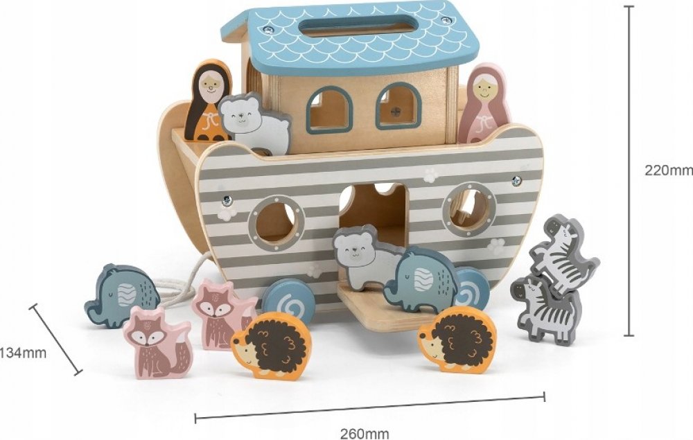 Hračka se skládá z figurek Noeho a jeho ženy, 5 dvojic zvířátek (slonů, lišek, ježků, zeber a ledních medvědů) a lodi na kolečkách s přiloženým provázkem na tahání. Ve střeše archy je vyříznuta r...