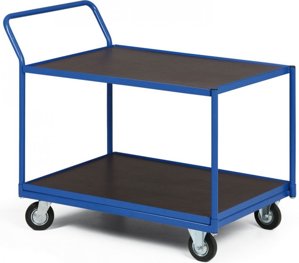 Dílenský policový vozík na přepravu zboží či materiálu. Konstrukce vozíku je svařena z ocelových profilů. Nosnost vozíku je 400 kg. Lakováno vypalovacím práškovým lakem v odstínu RAL 5005 - modrá. Police z voděodolné překližky má vysokou nosnost a odolnost proti povrchovému poškození. Rozměr police je 1000 x 700 mm. Kola jsou vybavena poklicí, která brání namotávání nití a provázků a také zanášení ložiska různými nečistotami, čímž se prodlužuje životnost kola. Kola jsou o průměru 200 mm a 2 jsou pevná a 2 otočná podle vlastní osy. Kola lze na objednávku doplnit o dvojčinnou brzdou proti pojezdu i proti otáčení kolem svislé osy.