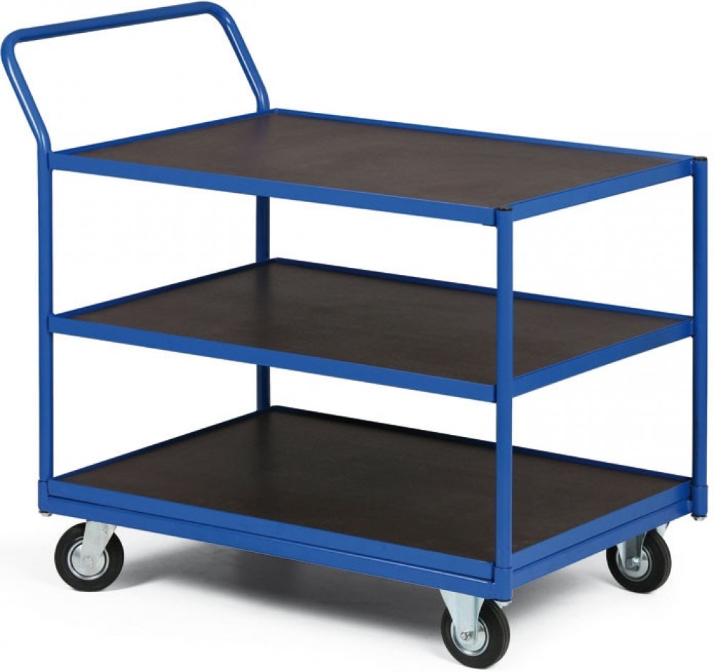 Dílenský policový vozík na přepravu zboží či materiálu. Konstrukce vozíku je svařena z ocelových profilů. Nosnost vozíku je 300 kg. Lakováno vypalovacím práškovým lakem v odstínu RAL 5005 - modrá. Police z voděodolné překližky má vysokou nosnost a odolnost proti povrchovému poškození. Rozměr police je 1000 x 700 mm. Kola jsou vybavena poklicí, která brání namotávání nití a p...