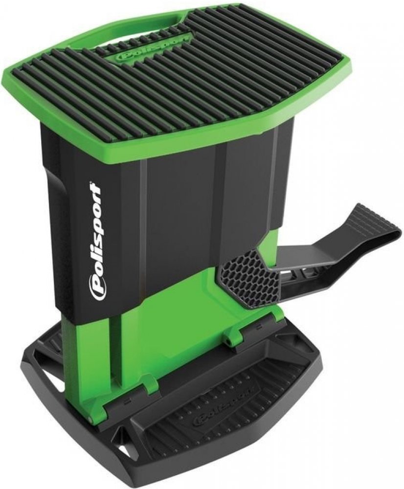 Polisport Zvedací stojan je první hybridní stojan (vyrobený z plastu a kovu), který je zároveň zvedací a skládací. Pomocí zvedací páky zvednete motocykl s minimálním úsilím. Má pevnou a odolnou strukturu, která je zesílená kovovým rámem. Díky tomu má stojan nosnost až 200 kg. Vrchní část je vyrobena z gumového kompozitu, který zajišťuje stabilitu motocyklu. Úložné přihrádky se hodí na odložení nář...