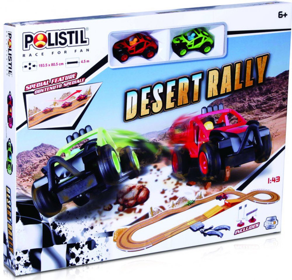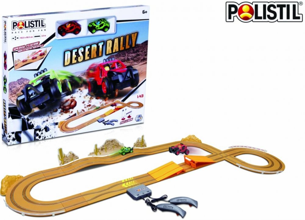 Polistil Autodráha 1:43 Desert Rally - uživatelsky jednoduchá analogová elektrická autodráha, napájena pomocí tužkových baterií. Podle obrázku v manuálu sestavíte díly autodráhy připojíte ovladače a doplníte 8x AA tužkové baterie - EM-B1320. Zapnete vypínač na startovní rovince a už můžete začít závodit. Každý ovladač řídí jedno autíčko na jedné dráze. Autodráha pro děti se dvěma jízdními pruhy má délku 4,5m. Pro složení je nutný prostor 193,5 x 80,5 cm.