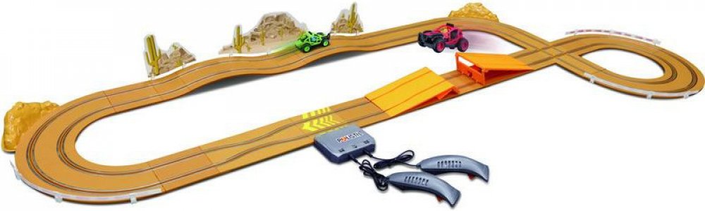 Traťové díly autodráhy v hnědé barvě imitují šotolinu, jako na skutečných závodech rally. Na dráze je plno zábavných prvků: skokánek, zúžení, křižovatka a terénní vlny. Nechybí ani okolní krajina v podobě skal. Rychlost autíček se reguluje pomocí ovladačů spojených s dráhou kabelem s konektorem Jack. Součástí balení jsou dráhová autíčka v provedení Buggy Rally.