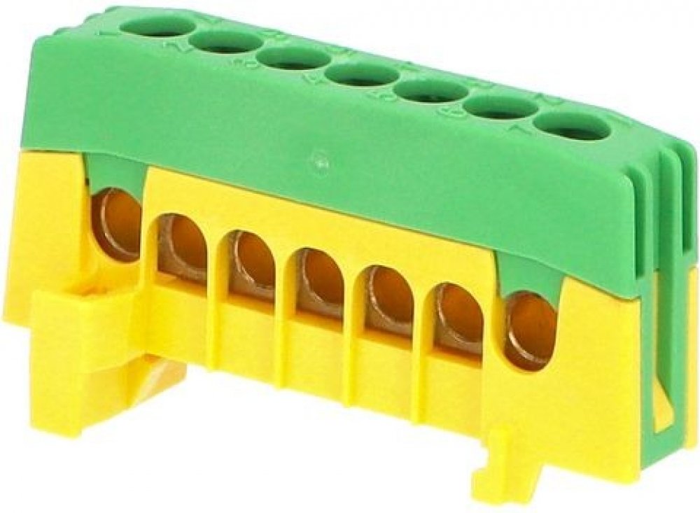 Můstek PE 7-F2 (svorkovnice 7x16mm2), krytý IP20, zeleno-žlutý, 63A, na DIN, rozměr 60x12x27mm. Rozbočovací svorky - můstky na nosnou lištu jsou hojně používány v rozváděčích nízkého napětí či v dalších aplikacích, kde potřebujeme spojit více vodičů na jeden potenciál. Používá se např. jako nulový můstek “N” nebo jako můstek pro ochranný vodič “PE”. Můstky se vyrábí jako nekryté (IP00) nebo kryté (IP20), v barevných variantách šedá, černá, modrá a zelená a zeleno-žlutá. Počet připojovacích míst je od 7 až do 15 o max. průřezu 16 mm2. Svorky jsou určeny pro montáž na nosnou lištu 35 mm (DIN lištu). Vodiče se do svorek po odizolování připevňují pomocí šroubového spojení. Šroub dosedá přímo na vodič, proto je nutné jemně slaněné vodiče opatřit dutinkou. Dutinka ale zvětší průřez vodiče a proto je nutné připojovat slaněné vodiče o řád menší než uvedené průřezy. U pevných vodičů toto není nutné.