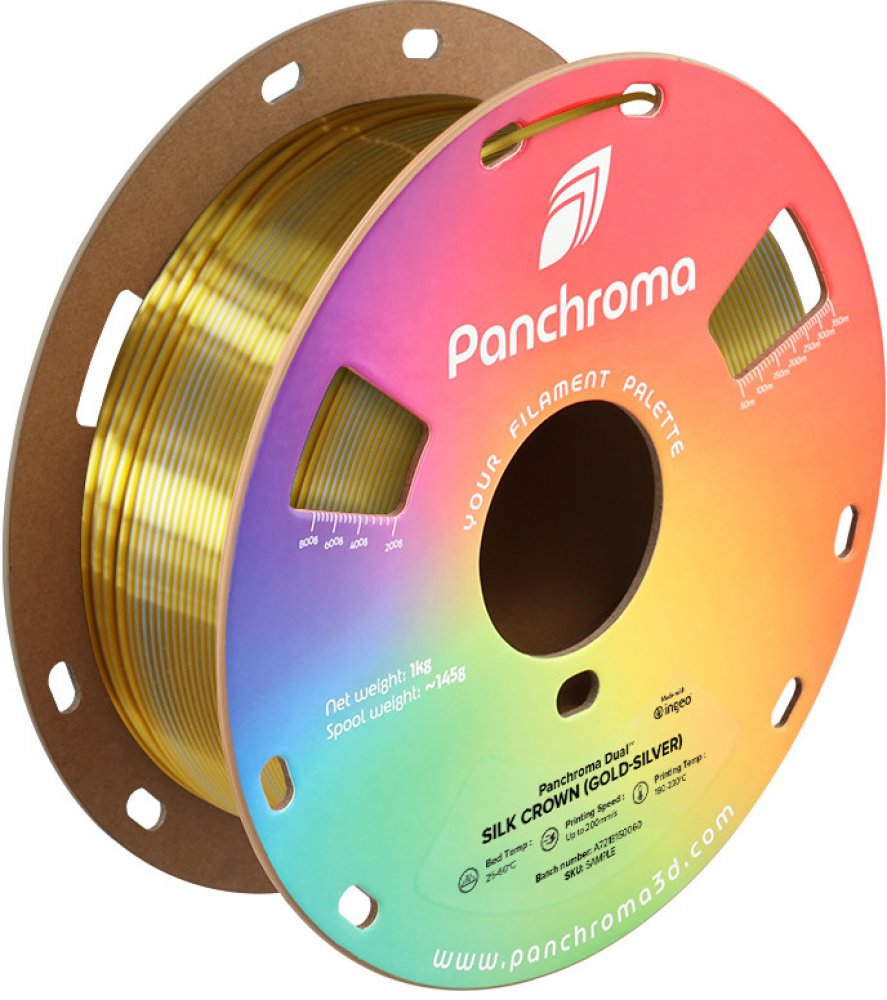 Parametry Panchroma Dual SilkKompatibilita Bambu Lab AMSDoporučená teplota tisku 190 - 230 °C Teplota podložky 25 - 60 °C Průměr 1,75 mmBarva zlatá, stříbrnáHmotnost 1000 gVlastnosti Panchroma Dual Silk