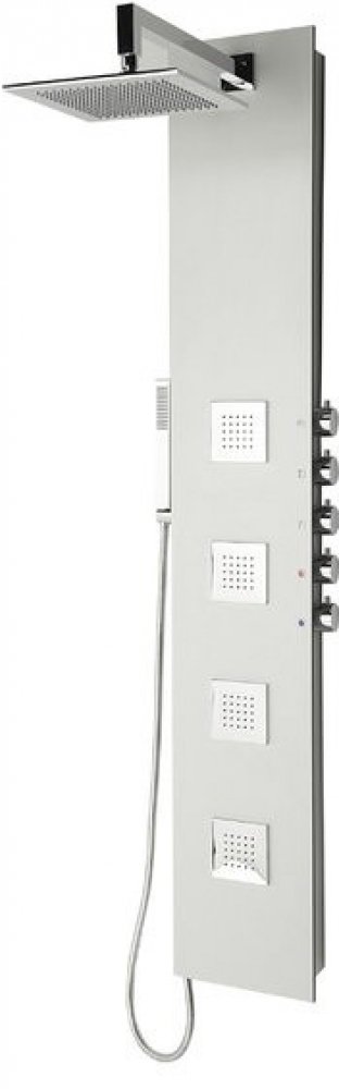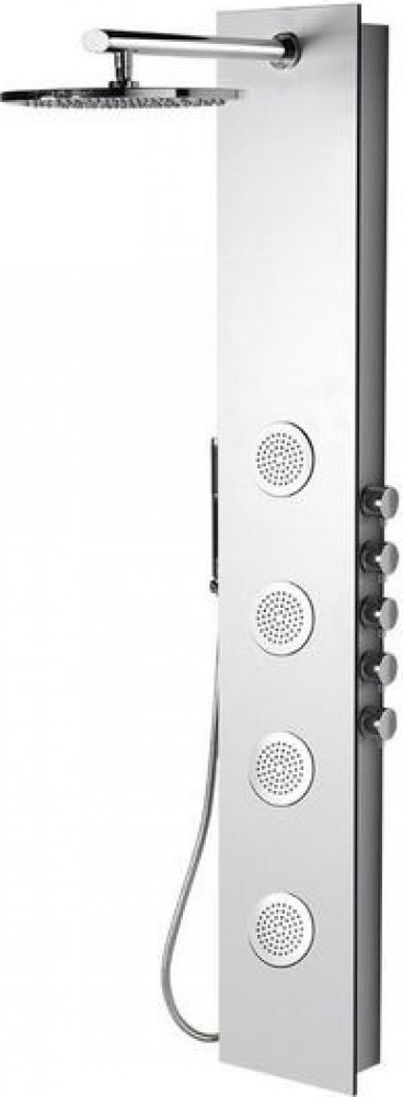 Sprchový kout v moderní koupelně dotváří elegantní sprchový panel, který oproti klasické baterii nabízí výběr proudu vody nejenom z ruční sprchy, ale i z hlavové sprchy, popřípadě i z trysek. Sprchové panely lze zvolit v moderním stříbrném, efektním dřevěném nebo čistém bílém dekoru a tím lze získat perfektní soulad s obkladem interiéru. Panel 5SIDE je vyroben z kompozitního materiálu nebo akrylátu (bílá barva) a je určen pro montáž na stěnu. Ovládací prvky panelu jsou netradičně umístěny na boku, čímž je možno využít celé přední plochy panelu pro větší trysky.
