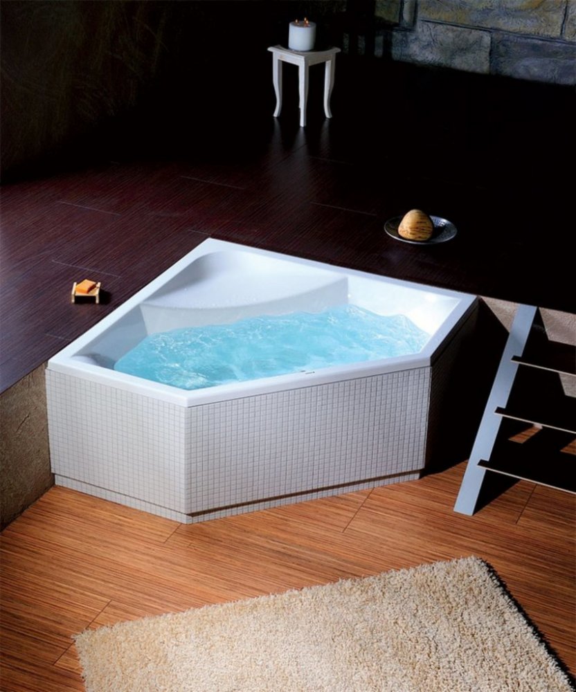 Vana s pohodlně tvarovanými stěnami pro opření zad na obou stranách a odtokem umístěným uprostřed.