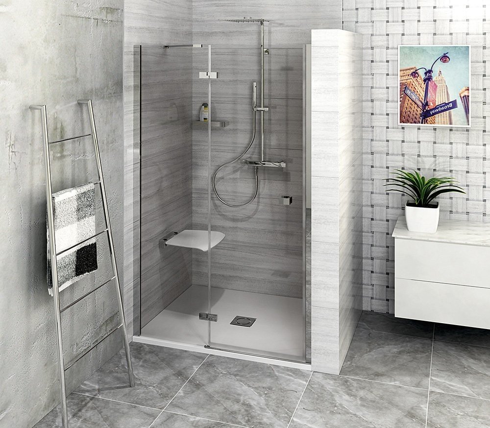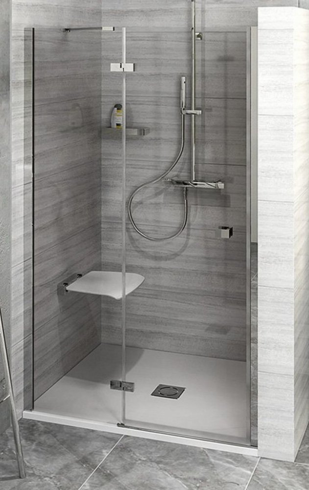 Pochromované madlo Mosazné pochromované panty se zvedací funkcí... ... z vnitřní strany zapuštěné do skla Stabilitu zástěn zajišťuje rohová vzpěra Dokumenty ke stažení zde