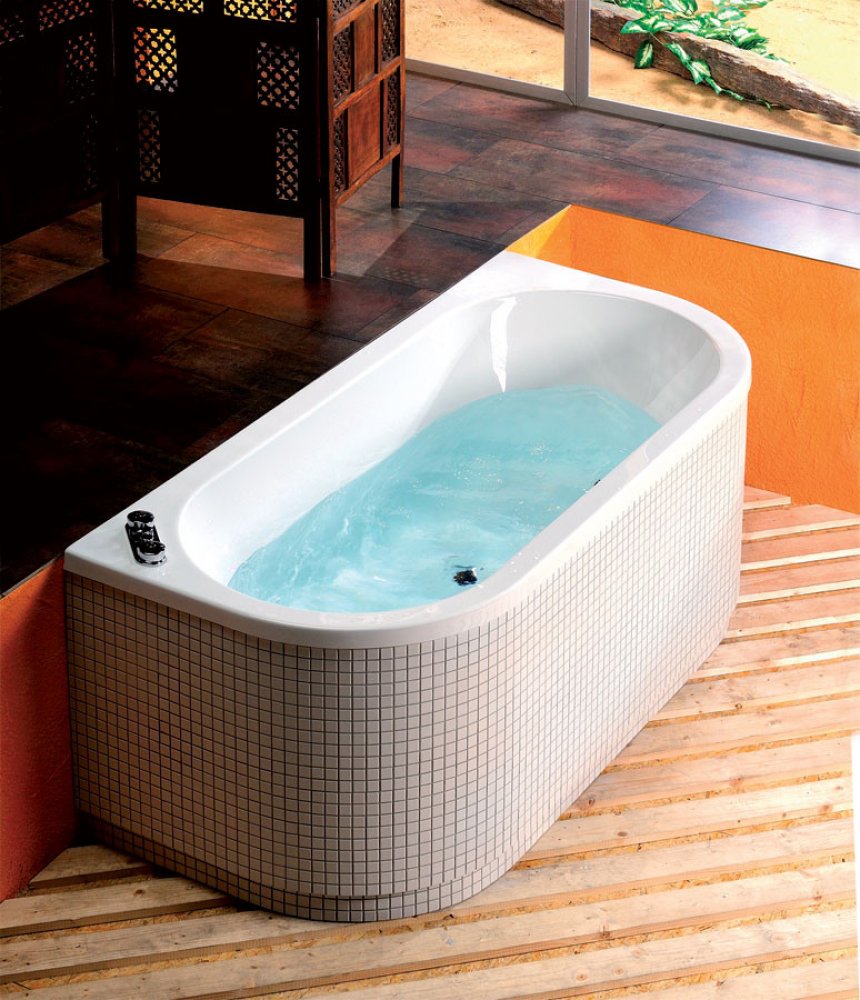 Vana s pohodlně tvarovanými stěnami pro opření zad na obou stranách a odtokem umístěným uprostřed.