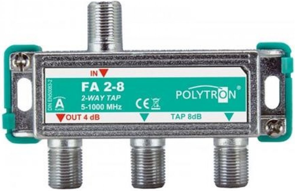 Polytron TAP FA 2-8 8 dB 5-1000 MHz je charakterizován vysokou kvalitou provedení. Disponuje jednou průchozí a dvěma odbočovacími větvemi. - Vynikající frekvenční odezva - Vysoký screeningový faktor> 100 dB plně pájeného obvodu - EMI odolnost vůči elektromagnetickému rušení - Zahrnuty plastové držáky pro montáž na zeď - Vhodné i pro zpětný kanál - 4mm zemnící svorka^2 Průchozí útlum 4 dB Odbočovací útlum 2x8 dB Izolace mezi výstupy 24 dB