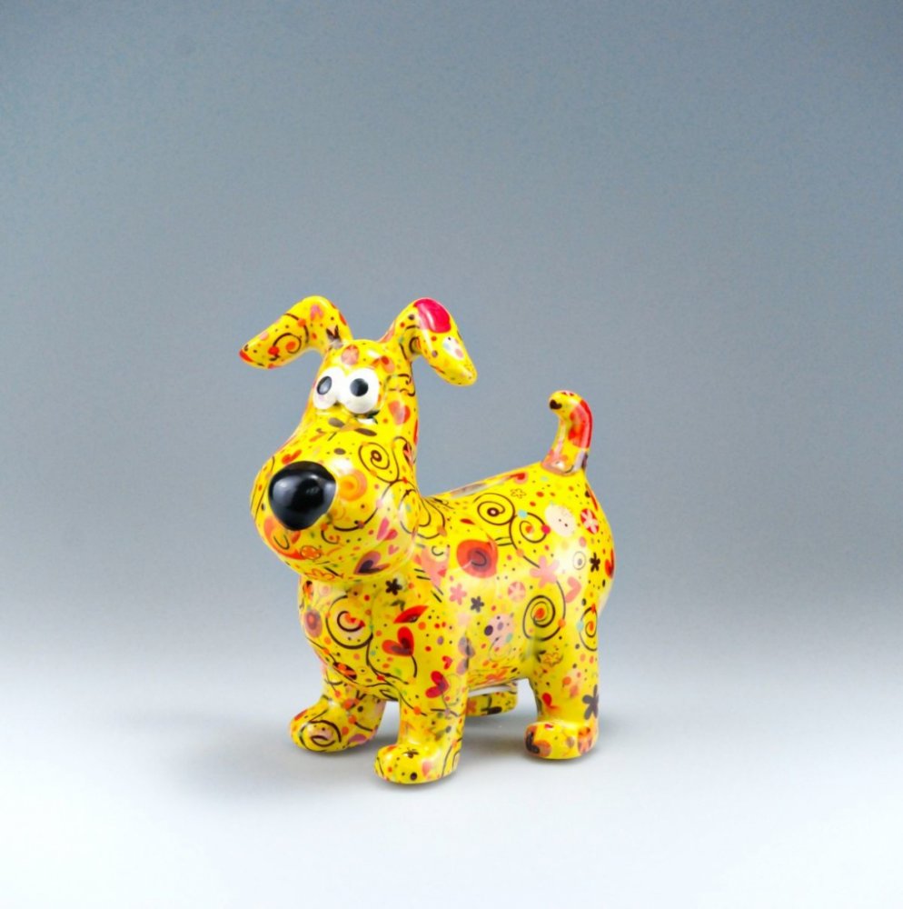 Kasička pes ve žluté barvě s dekorem srdíček pochází z dílny mladých belgických návrhářů značky Pomme Pidou, kteří jsou známí po celé Evropě pro své barevné a nápadité doplňky do domácnosti. Každou kasičku vyrábějí ručně z kvalitní keramiky a zdobí ji veselý motiv, díky němuž se z obyčejného spoření stává zábavná hra. Pejsek působí přátelsky a hravě, takže si ho děti okamžitě oblíbí a s radostí do něj ukládají první úspory.