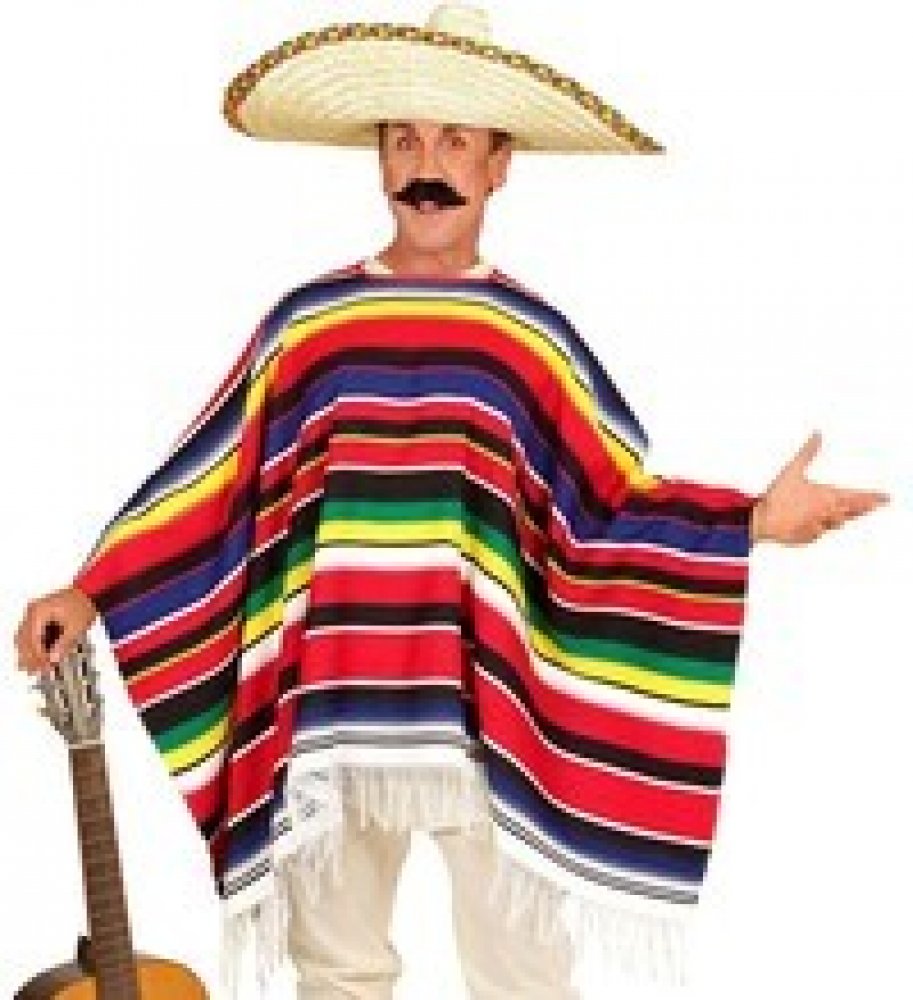 Tradiční mexické pončo původně sloužilo jako ochrana před deštěm a chladem. Dnes už si ho lidé spojují s mexičany jako neodmyslitelný doplněk. Pokud tedy vyrážíte na karneval nebo Halloween jako mexičan, neměli byste si zapomenout pořídit tak podstatný detail, jako je pončo, které doladí celý kostým.Tmavě modré mexické pončo zdobí bílé třásně a decentní pruhy. Pončo je ušité z pletené tkaniny.