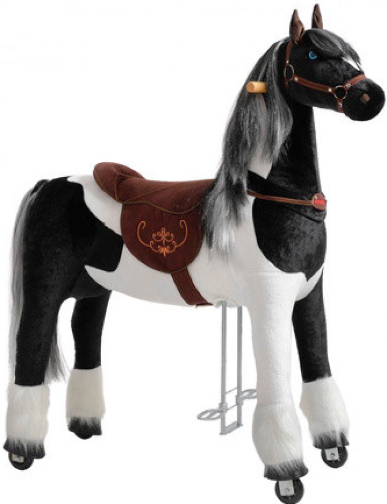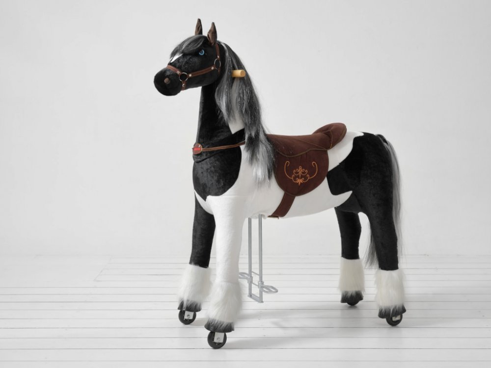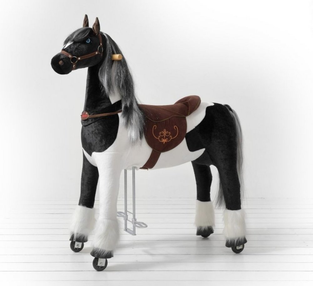 Ponnie Jezdící kůň Domino XL PROFI 9-99 let max. váha jezdce 100 kg Domino XL Ponnie je unikátní hračkou, která kombinuje roztomilost a jemnost plyšové hračky s nápaditým mechanismem fitness přístroje. Koník rozvíjí koordinaci pohybů dítěte a zapojuje důležité svalové partie, které nejsou běžně zatěžovány. Do pohybu se uvede dětskými pohyby nohou a následně celého těla, které reálně připomínají jízdu na skutečném koni (nemá motor a nejsou potřeba ani žádné baterie). Koník se rozjede nasedáním a vysedáním ze sedla a opřením o nožní madlo. Směr jízdy si určuje dítě natáčením madel. Kostra koníka je vyrobena z odolné kovové konstrukce a koník se pohybuje na obdobných kolečkách, jako jsou na in-line bruslích. PROFI koníci mají nastavitelnou délku stupátka, dle výšky jezdce. Kůň v černo bílé barvě jezdí bez problémů na koberci, dlažbě, parketách i plovoucí podlaze. Kolečka jsou z bezbarvé gumy, takže nedochází k poškrábání ani zabarvení podlahy. Venku se dá na koníkovi jezdit na asfaltových površích i zámkové dlažbě. Výrobek je určen pro jízdu na hladkých rovinatých površích. Nemá brzdný systém a je navržen tak, aby při jízdě na rovinatém povrchu nedosáhl nebezpečné rychlosti. Balení a montáž – produkty jsou baleny v kartonové krabici. Jsou plně sestaveny, je jen potřeba připevnit hlavu na trup výrobku jednoduchým utažením šroubu a zapnutím zipu. Určen pro děti ve věku od 9 let max. váha jezdce 100 kg, optimální výška od 130 cm výška sedu 86 cm, délka nohy jezdce od 69 cm Délka 124, šířka 46, výška 133 cm, váha 28 kg PROFI koníci mají nastavitelnou délku stupátka, dle výšky jezdce