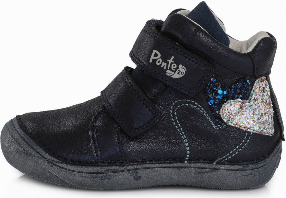 Kožená kotníková dětská obuv na suchý zip s kompromisní barefootovou podrážkou. Nádherný tmavě modrý model s kamínky ve tvaru srdce.