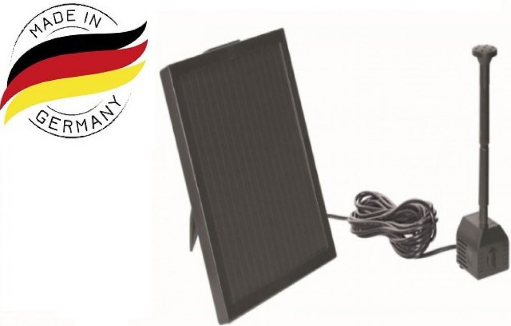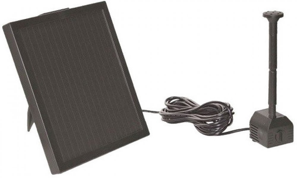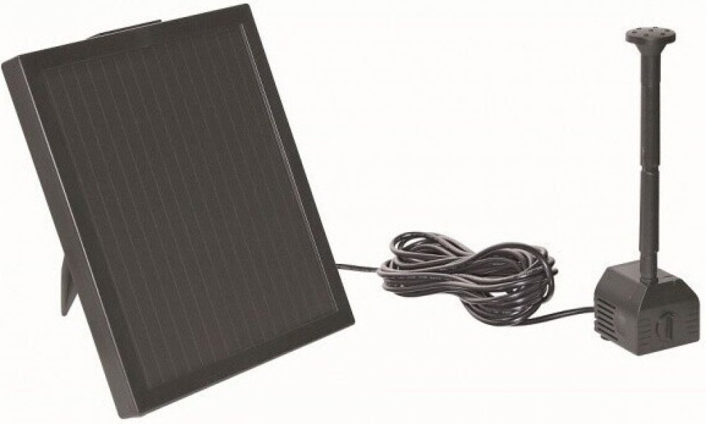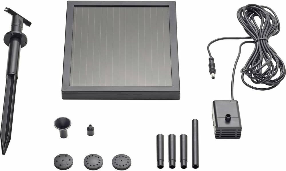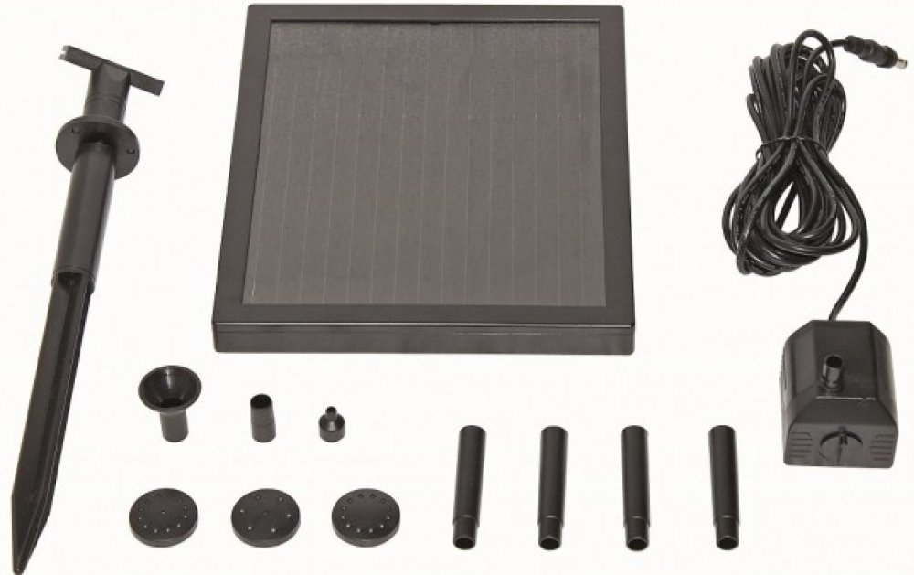 Sada obsahuje fontánové čerpadlo 6V s průtokem vody 150 l/hod., solární panel s výkonem 1,4 W s maximálním výtlakem vody 0,6 m.