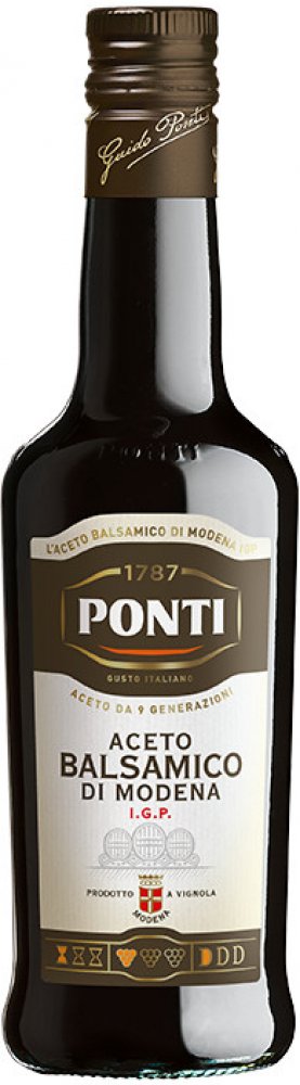 Balzamikový ocet Ponti Aceto Balsamico Di Modena I.G.P.se získává pečlivým octováním hroznového moštu, pocházejícího z hroznů 7 vybraných odrůd révy a jemného vinného octa Ponti. Perfektní pro ochucení syrového a vařeného červeného masa, čerstvých a vyzrálých sýrů, zeleniny a jahod.
