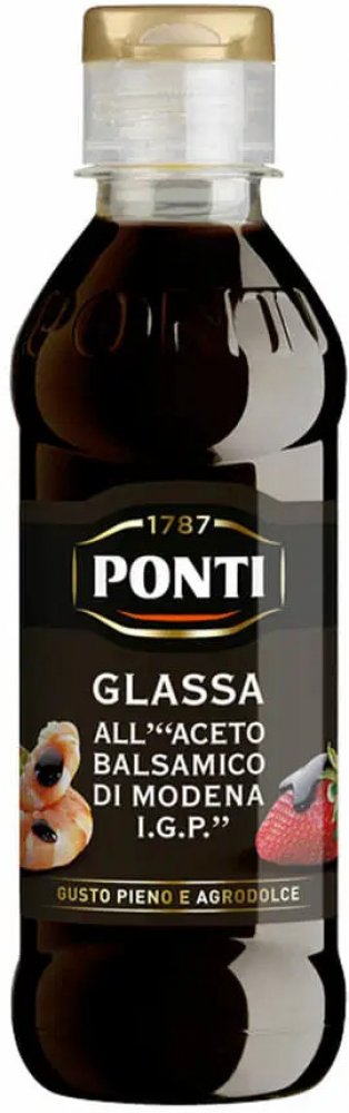 Ponti Glassa Gastronomica a base di aceto balsamico di Modena, je poleva z balzamikového octa (38%). Na bázi smaženého hroznového moštu s jemným nádechem sladkosti s vynikající chutí. je vhodný pro zušlechťování předkrmů, masa a ryb, sýrů i koláčů. Ideální jako doplněk k antipasti, hlavním jídlům a dezertům. Skvělé pro nápadité dekorace.