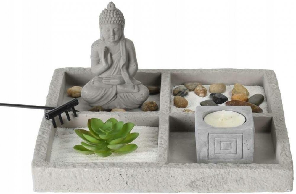 Relaxační set vyrobený z odolného cementu obsahuje figurku Buddhy, svíčky, hrábě, ozdobné kameny, umělou rostlinu