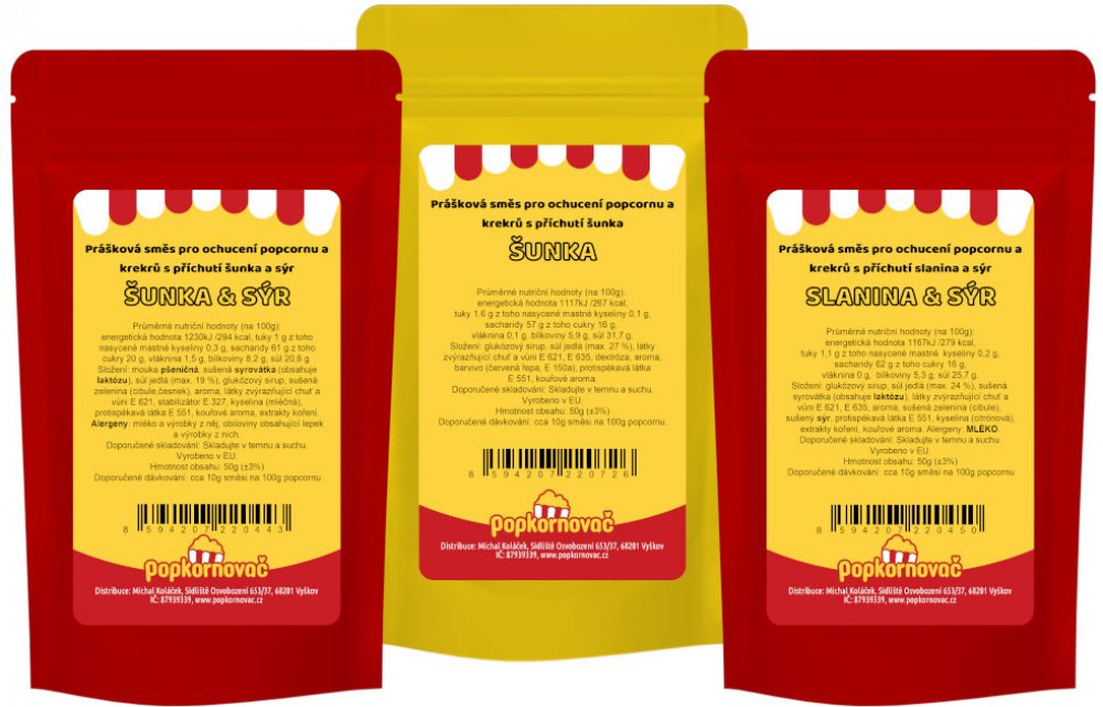 Cenově zvýhodněný balíček tří 50g příchutí na popcorn a krekry (šunka-sýr, slanina-sýr, šunka).