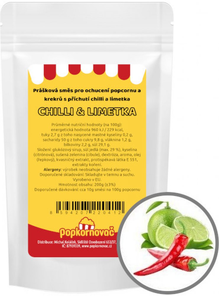 Kořenící směs v prášku s příchutí "chilli & limetka" pro ochucení popcornu a krekrů na smažení. Jedno balení kořenící směsi vystačí až na 20 porcí upraženého popcornu (při doporučeném dávkování 100g kukuřice/10g kořenící směsi).