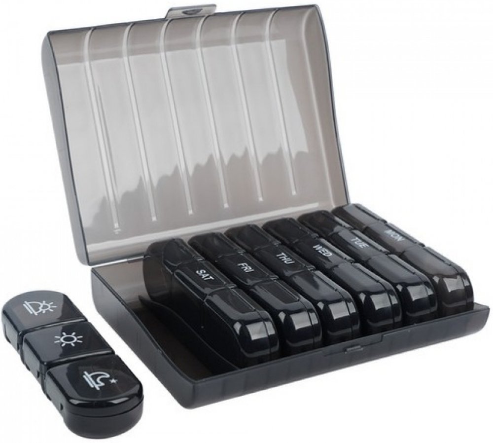 TRANSPARENTNÍ SYSTÉM DĚLENÍ DO DENNÍ DOBY - součástí je každý ze sedmi kontejnerů v organizéru rozdělena na tři samostatné komory , značené symboly, které označují denní dobu: ráno, poledne a večer . Každá přihrádka se uzavírá samostatně na zacvaknutí, což zajišťuje bezpečné uložení léků a chrání je před vlhkostí a kontaminací. Přehledné značení pomáhá při rychlé a bezchybné přípravě vhodných dávek léků pro kteroukoli denní dobu.