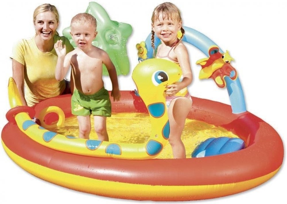 Kytička fontána, miniskluzavka a 2 nafukovací kroužky v hracím centru po připojení k zahradní hadici zajistí osvěžení v horkých dnech. Můžete použít i s balonky.Materiál: masivní vinyl bez ftalátů, s pevnými švy.Rozměry 193 x 150 x 89cmObjem: 136L (75% obsahu),váha 2,6kgPro děti od 3 let Není určeno pro děti mladší 3 let.