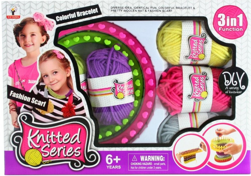 \nSada pletení obsahuje 5 klubek vlny, 2 tkalcovské stavy o průměru cca 21 cm a 17 cm, háček a návod na výrobu. Výsledným výrobkem může být barevný náhrdelník, šála nebo čepice. Rozměry balení cca 41