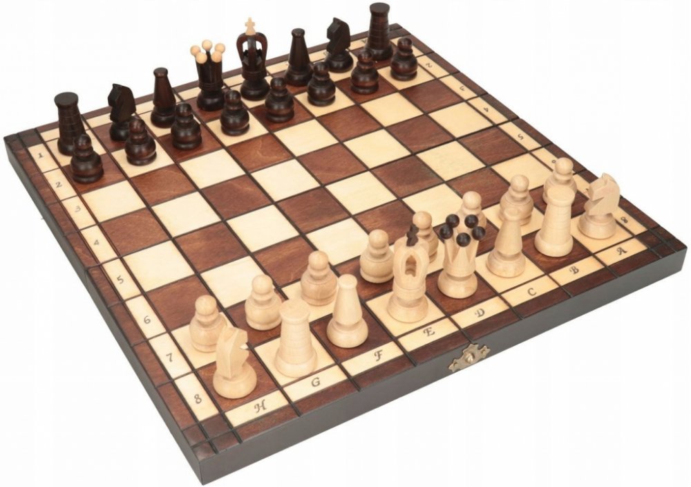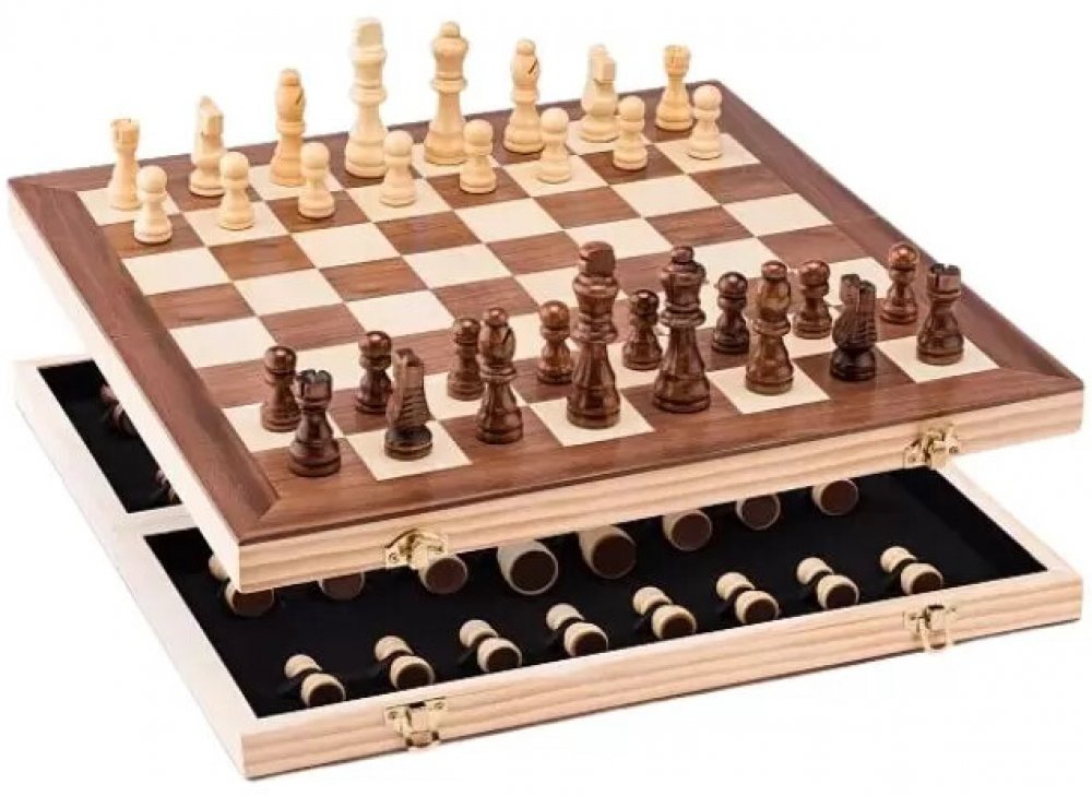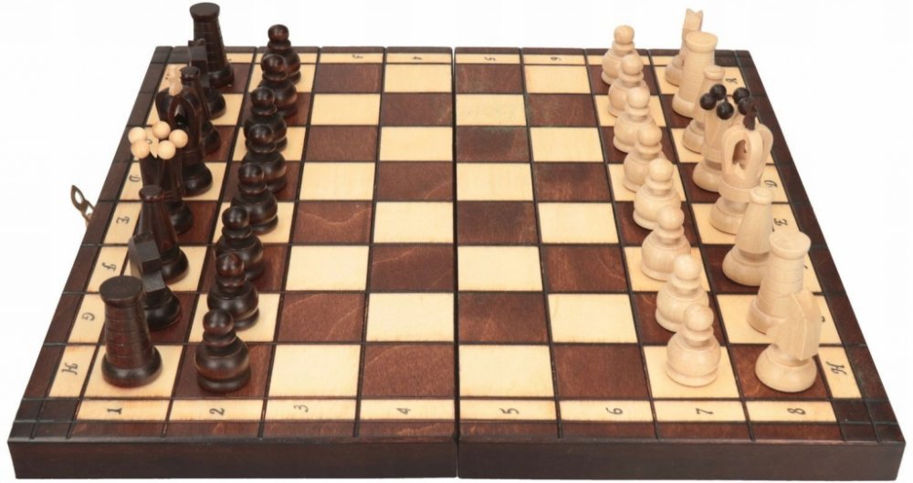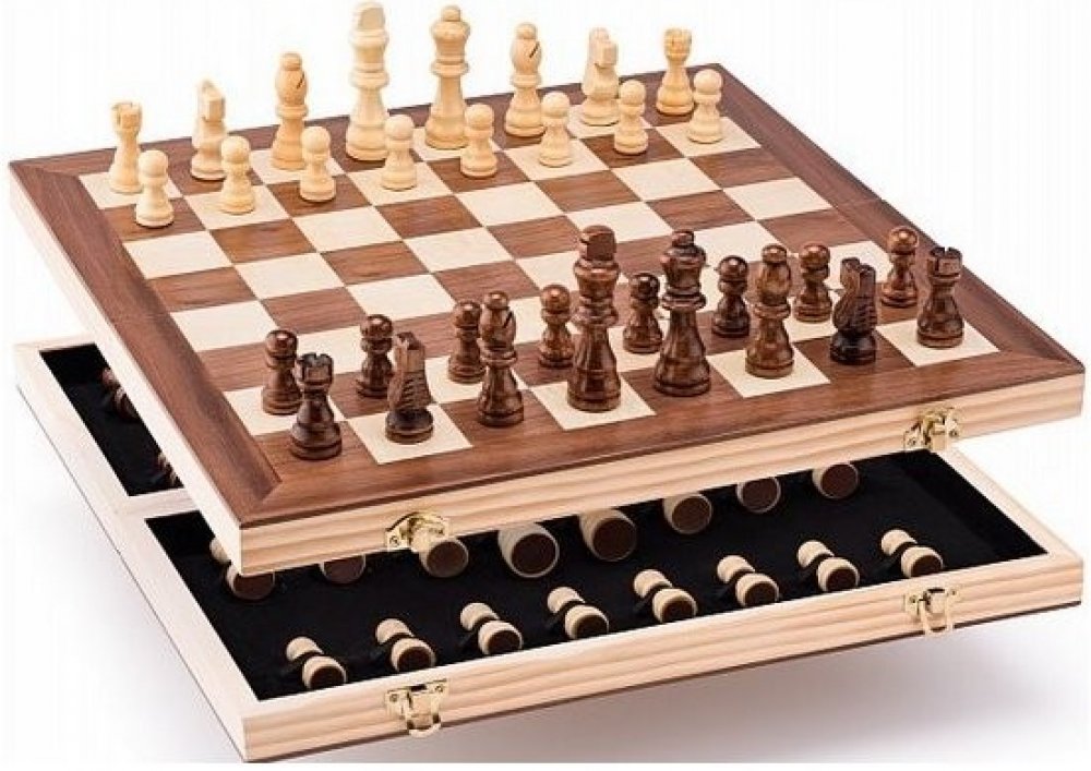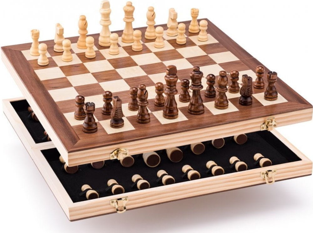 Luxusní provedení šachů v praktickém dřevěném boxu. Šachovnice je zpracována jako intarzie dvou barev dřeva. Figurky se po ukončení hry uskladní uvnitř složeného boxu. Součástí hry je návod.