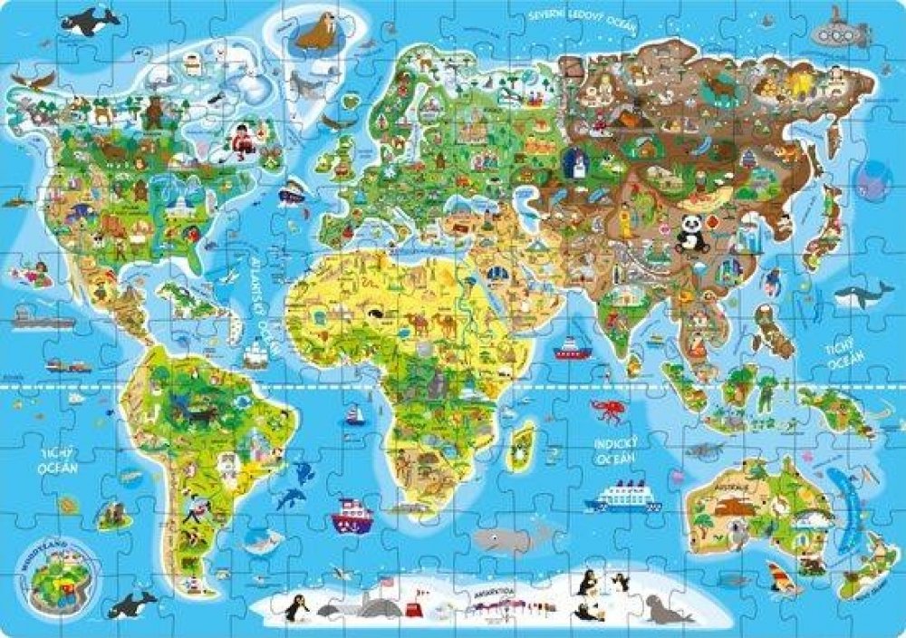 Zeměpisné puzzle pro děti s mapou světa a ilustracemi v podobě světových