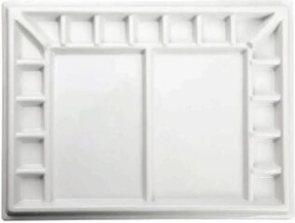 Porcelánová paleta obdélníková velká 17 důlků 25x33cm Keramická paleta vyrobená z prémiového ekologického materiálu. Praktické uspořádání 17 hlubokých přihrádek na barvy po obvodu dvou hlavních míchacích ploch. Paleta je extra odolná, těžká, dvojitě silná. Paleta má široké použití, hodí se pro akvarelové, kvašové, akrylové, olejové i temperové barvy. rozměr 33 x 25 prémiová ekologická keramika