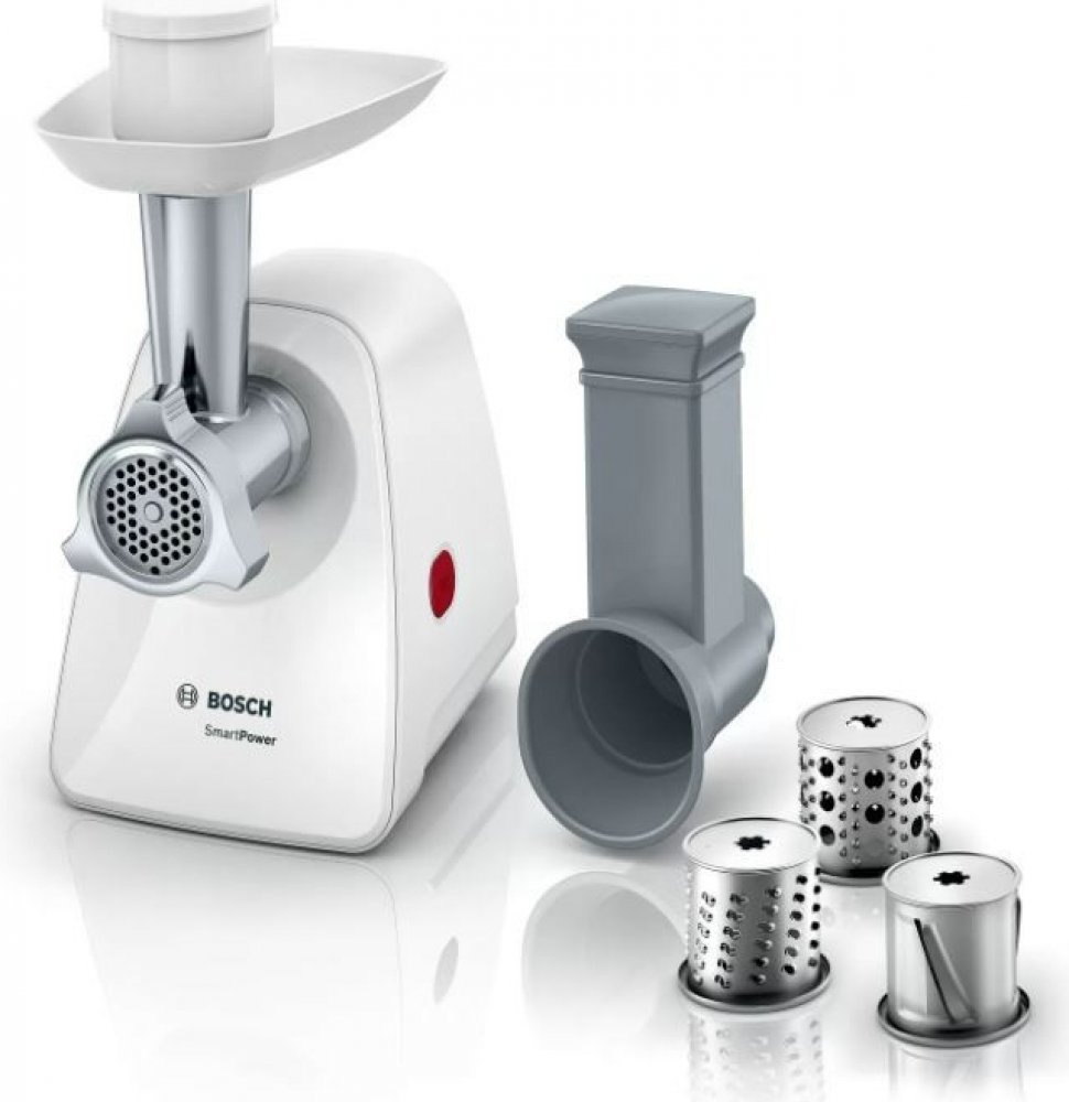 Vynikající výsledky při maximální rychlosti. Chcete vynikající výsledky i u obtížně zpracovatelných surovin? Díky velmi výkonnému motoru a vysoké blokovací síle motoru jsou všechny přísady zpracovány rovnoměrně a velmi rychle. To znamená více času na přípravu dalších pokrmů.Rovnoměrně zpracované přísady ve velmi krátkém čase. Ať už se jedná o mleté maso na hamburgery nebo klobásy, většina pokrmů chutná lépe, když jsou přísady zpracovány jemně. Mlýnek na maso zajišťuje vysokou účinnost a rovnoměrné zpracování přísad v co nejkratším čase.Úspora místa na kuchyňské lince a ve skladu Do našich kuchyní se musí vejít spousta věcí. Mlýnek na maso díky svým kompaktním rozměrům zabírá málo místa na pracovní desce i při skladování.Vhodná oka pro různé druhy potravin Kvalita, které můžete důvěřovat. Nerezová ocel je odolný a robustní materiál. Síta z takové oceli mají hladký povrch, nemění chuť potravin, s nimiž přicházejí do styku, a velmi snadno se čistí. To vše z ní činí nejlepší materiál pro použití v mlýnku na maso.Stabilita na pracovní ploše díky promyšlené konstrukci. Mlýnek na maso, který se na pracovní ploše pohybuje, může být nebezpečím pro naši bezpečnost. Díky gumovým nožičkám v základně spotřebiče je strojek Bosch na pracovní desce stabilní.Věděli jste, že mlýnek na maso umí víc než jen mlít maso? Díky více než 10 funkcím dokáže mlýnek na maso mlít nejrůznější druhy masa, ryby, strouhat zeleninu na hranolky, strouhat brambory na bramboráky, krájet sýr a mnoho dalšího. Jeho všestrannost z něj dělá flexibilního pomocníka pro každodenní vaření nebo pečení.