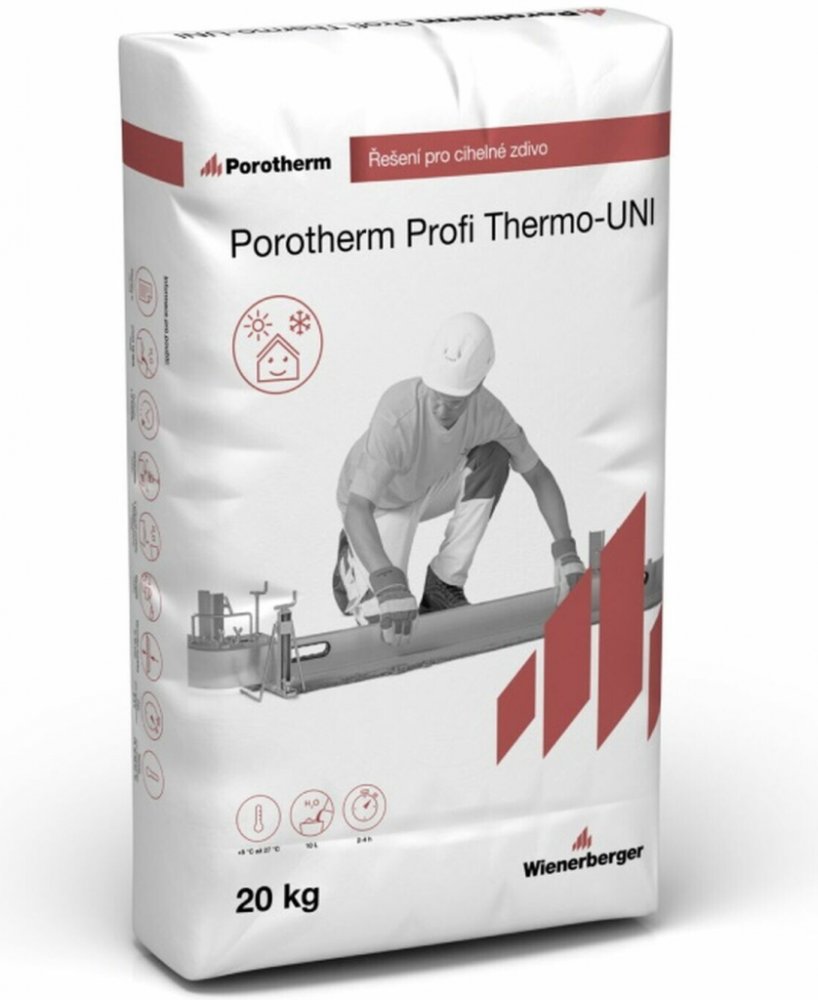 Porotherm Profi Thermo-UNI je minerální vápenocementová malta určená pro ruční zpracování. Používá se k přesnému vyrovnání první vrstvy broušených cihel na základech nebo na stropní desce.PoužitíJe určená pro snadné a přesné vyrovnání první vrstvy broušených cihel na základech nebo stropní descePro usazení keramických překladůK drobným opravám keramického zdivaMalta je určena pro ruční zpracováníVlastnostiJedná se o zakládací maltu s výbornými tepelněizolačními parametry, vysokou pevností v tlaku a vysokou vydatností určená nejen pro založení první řady zdiva.Technické parametryTyp: maltaZrnitost: 2 mmPevnost v tlaku: ≥ 10 N/mm²Vydatnost: cca 26 l hotové malty / 20 kg suché směsiBalení: 20 kg