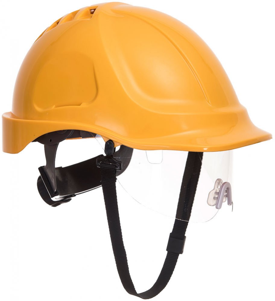 ENDURANCE VISOR PW55, přilba s integrovanými brýlemi Ventilovaná přilba s integrovanými brýlemi. Šestibodový hlavový kříž. Skořepina je vyrobena z odolného materiálu ABS. Přilba je nastavitelná 56-63 cm. Včetně potítka a podbradního pásku a zatahovacího hledí PW56. Vlastnosti: Odvětraná skořepina přilby umožňující cirkulaci vzduchu ochlazující hlavu nositele 6-bodový textilní postroj pro větší pohodlí a bezpečnost Nastavitelná velikost čelenky přes ráčnový systém Včetně upínacího popruhu Zatahovací štít je součástí Kompatibilní s držákem hledí na helmu PS58 Kompatibilní s PW47 a PS47 Clip-On Ear Muff Náhradní hledí je k dispozici Životnost až 7 let od data výroby (pokud není poškozená) Boční deformace CE certifikace Barvy: žlutá modrá oranžová bílá modrá Materiály: ABS, Polycarbonát Normy: EN 397 -30°C/+50°C, LD EN 166 1 FT Produktový list Prohlášení o shodě Certifikát Uživatelská příručka