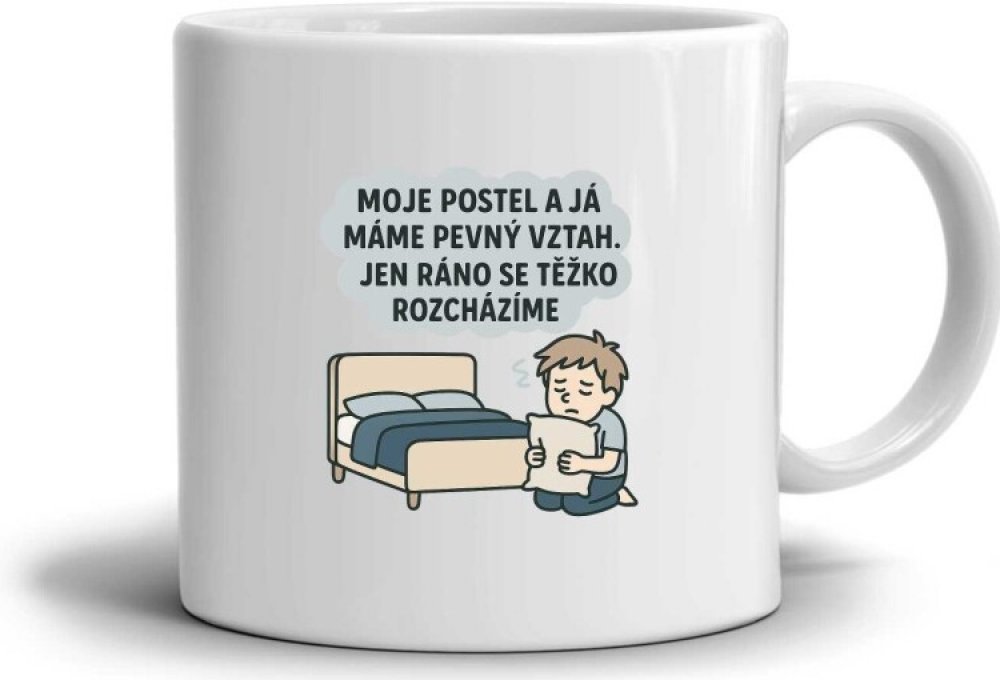 Citát s vtipným textem o posteli pobaví každého, kdo má ráno problém se vstáváním. Obrázek člověka, který se loučí se svou postelí, vystihuje známý ranní boj mezi pohodlím a povinnostmi. Ideální hrnek pro všechny milovníky spánku, kteří si váží každé minuty pod peřinou.