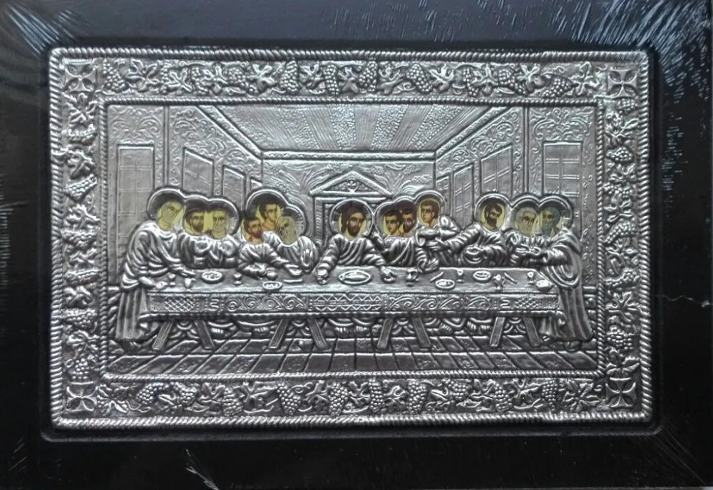 Kovová ikona Poslední večeře ukazuje klíčové scény z Nového zákona, kde Ježíš Kristus jí s jeho dvanácti apoštoly před svým ukřižováním. Během této večeře Ježíš ustanovil eucharistii, což je rituál, který je dodnes základním prvkem křesťanských bohoslužeb.