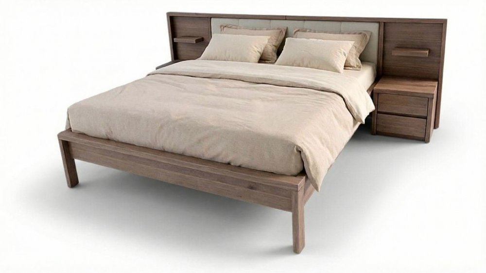 Postel z masivu MARINA BELLE včetně nočních stolků a poličky na konstrukci s čalouněnou výplní hlavového čela. Postel se vyrábí pouze z tvrdých masivních dřevin o síle 4 cm. Noční stolky 60x40. Značkové kování s doživotní zárukou od Hettich Výběr z více druhů oleje a rozměrů postele.