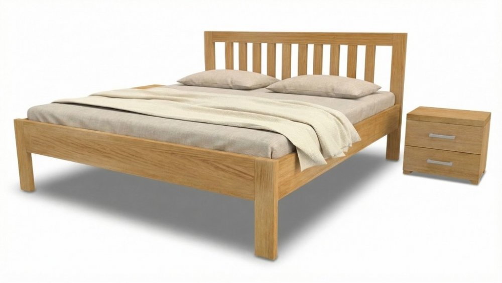 Postel z masivu MIA dub je vzdušná postel s hlavovým čelem vyplněným šprušlemi. Dubové masivní tvrdé dřevo o síle 3,7 cm. Značkové kování s doživotní zárukou od Hettich Výběr z více druhů mořidel a rozměrů postele. Volitelná výška hlavového čela 90 cm, nebo 100 cm.