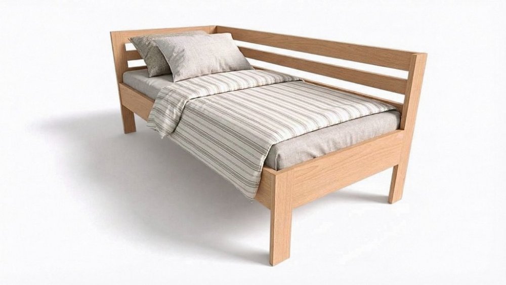 Jednolůžková postel PAVEL do L se šprušlovaným hlavovým čelem z bukového masivu o šířce 2,8 cm nebo za příplatek 4 cm. Provedení masiv Buk nebo za přípltek Dub. Povrchová úprava 100% přírodní olejo-vosk od BIOFA. Výběr z více druhů barevného provedení oleje.