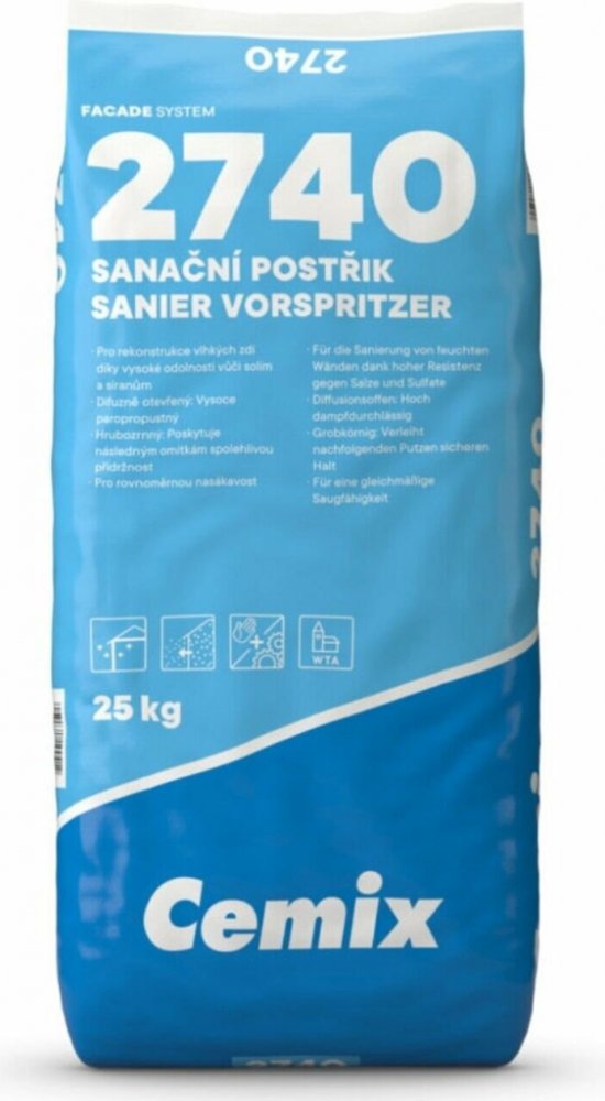 Sanační postřik Cemix 2740 na problémy s vlhkostí. Kontaktní můstek pro kamenné, cihelné a smíšené zdivo před aplikací sanačních omítek. Pro vnitřní i vnější použití.PoužitíPro rekonstrukce vlhkých zdí díky vyšší odolnosti vůči solím a síranůmK použití v rámci sanačního systému, certifikováno WTAPro vnitřní i vnější použitíPro ruční a strojní zpracováníVlastnostiSpolehlivá přídržnost pro sanační systémDifuzně otevřenýSplňuje požadavky WTAParopropustnýTechnické parametryAplikační teplota: 5 °- 30 °CZrnitost: 4 mmZpracovatelnost: 120 min.Spotřeba: 0,95 kg/m²/mmBalení: 25 kg
