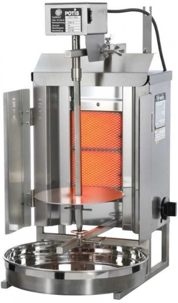 Plynový gyros gril je určen na maximální množství 7 kg masa, přičemž maximální výška produktu umístěného na jehle je 180 mm. Modely mají pohon jehly umístěn nahoře a jsou osazeny tepelným krytem motoru. Posuv vzdálenosti motoru, jehly a naklánění jehly umožňuje lépe regulovat teplotu v jednotlivých úrovních tepelně opracovávaného produktu. Gril lze regulovat za pomocí tří teplotních stupňů. Zaříze...