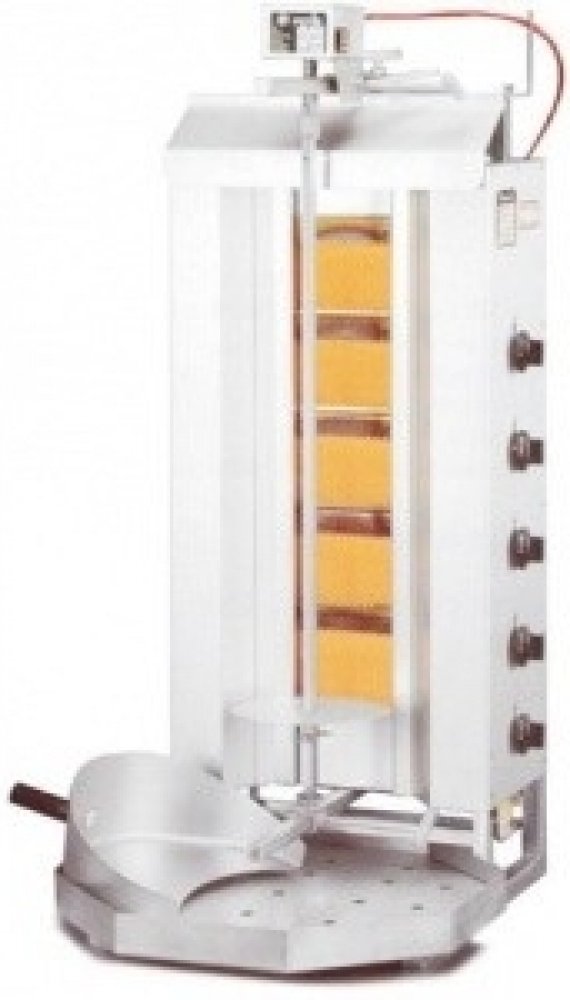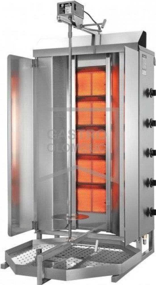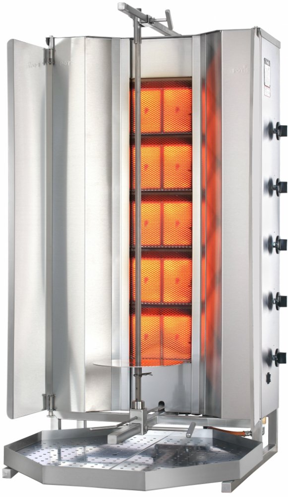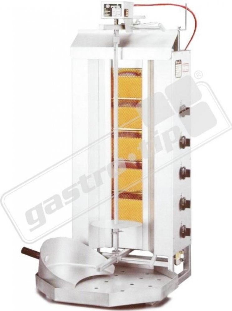 Plynový gril na gyros, model GD5/MU od Německé firmy POTIS. Kapacita 120kg. Model GD5/MU má pohon jehly umístěn dole (motorem je umístěn na zádech - bezpečně mimo dosah tuku a žárů). Posuv vzdálenosti motoru, jehly a naklánění jehly umožňuje lépe regulovat teplotu v jednotlivých úrovních tepelně opracovávaného produktu.