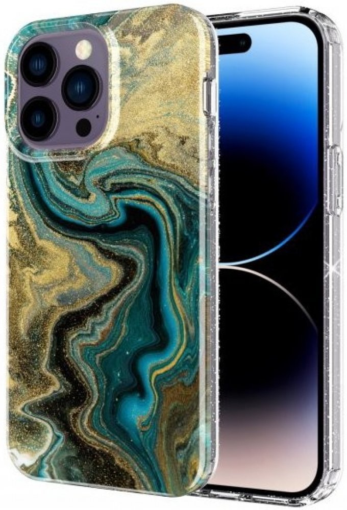 Pouzdro Appleking mramorové třpytivé iPhone 14 Pro Max - petrolejové