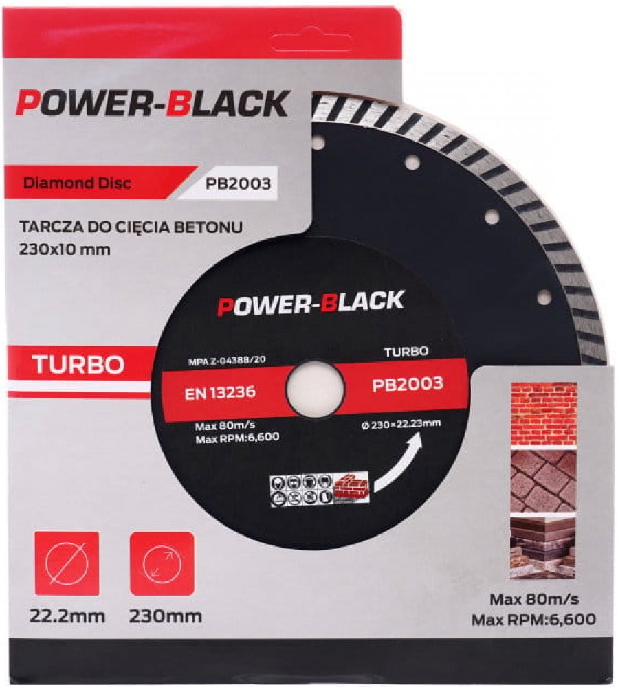 Diamantový kotouč POWER-BLACK turbo byl vyroben nejnovější výrobní technologií – má sintrovanou širokou zrnitost typu TURBO s vysokým diamantem koncentrace. To prodlužuje životnost kotouče a umožňuje ještě přesnější, čistější a rychlejší řez. Náš kotouč je určen pro vysoce kvalitní řezání betonu, pórobetonu, žuly, mramoru, cihel, cementových desek, slínku, střešních tašek, dlažební kostky, beton a další.