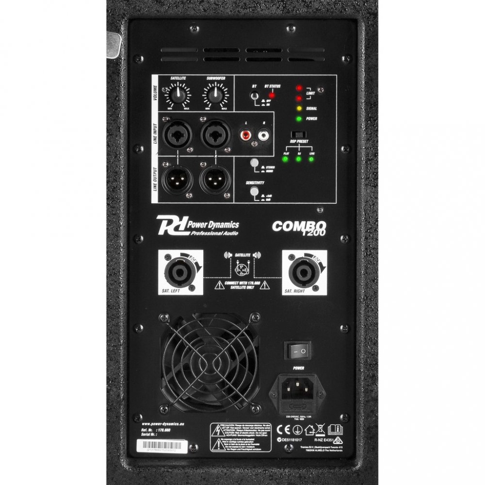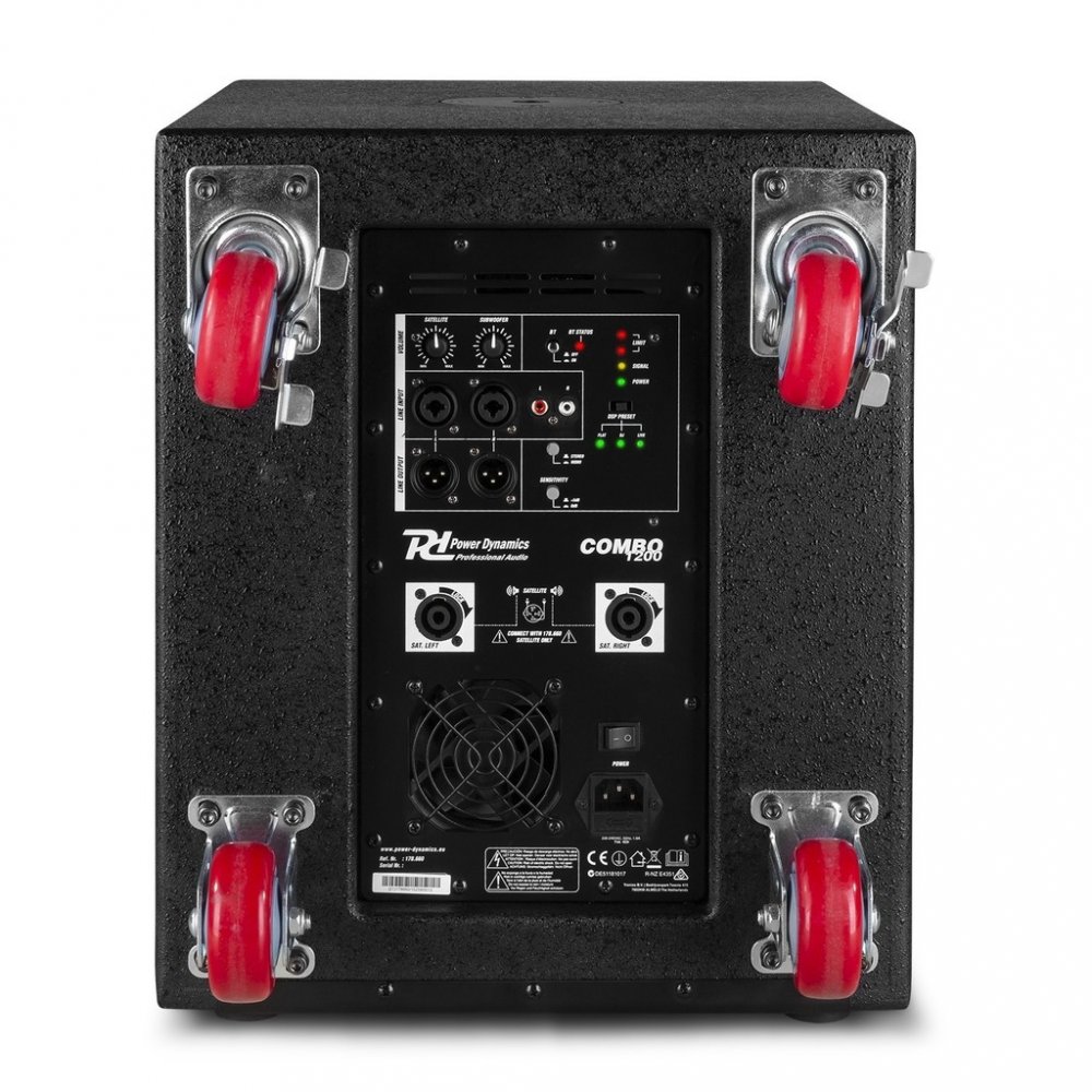Easy to transport active 1200W sound system suitable for mobile DJs, karaokeshows, drive-in shows and presentations. This professional set includes a 12 subwoofer (3" voice coil) and two 6.5" satellite speakers (midrange 1.5" voice coil and tweeter 1" voi...