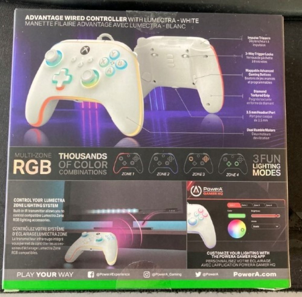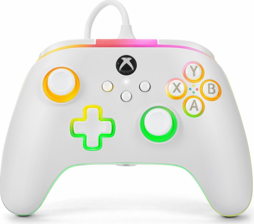 Herní drátový ovladač PowerA Advantage Lumectra pro Xbox Series, Xbox One a PC plný funkcí pro maximální zážitek ze hry. Disponuje zdířkou (3,5 mm jack), odnímatelným USB-C kabelem o délce 3 m, tlačítkem sdílení, intuitivním rozložením tlačítek, třícestnými zámky spouští, hmatovou odezvou, dvěma dunivými motůrky a více zónové RGB osvětlení.
