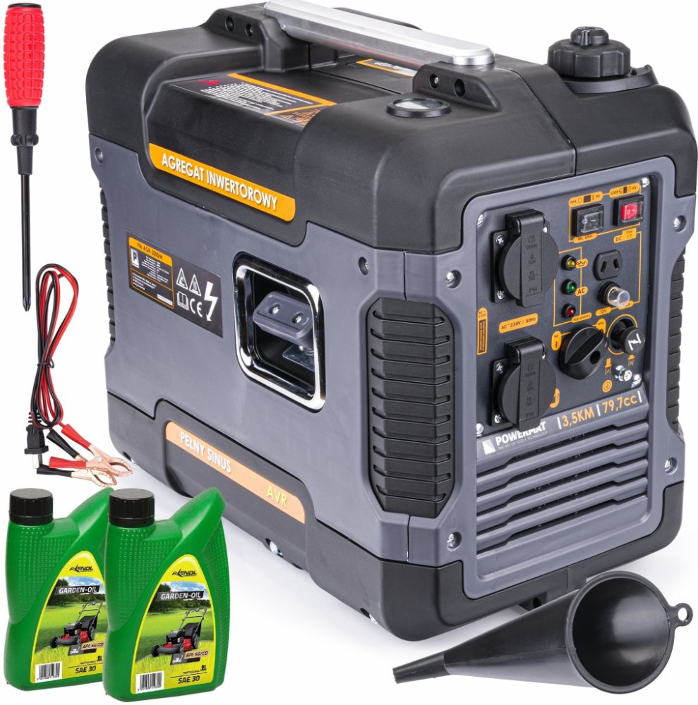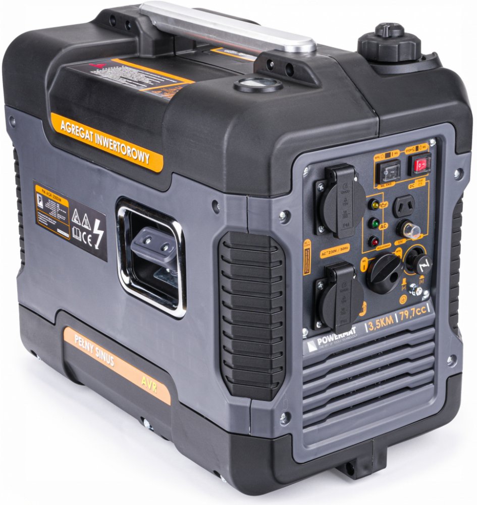 Generátor vyrábí elektřinu s napětím 230V (2 zásuvky) a stejnosměrný proud s napětím 12V. Ideální řešení při výpadku proudu v terénu. Vybaven voltmetrem a pojistkami. Jednotka má snímač hladiny oleje, který automaticky vypne motor, pokud je jeho hladina příliš nízká. Manuální spuštění jednotky - pomocí kabelu. Jednotka se používá v řemeslech, stavebnictví na pozemcích a zahradách pro práci s elektrickým nářadím, čerpadly, osvětlením.