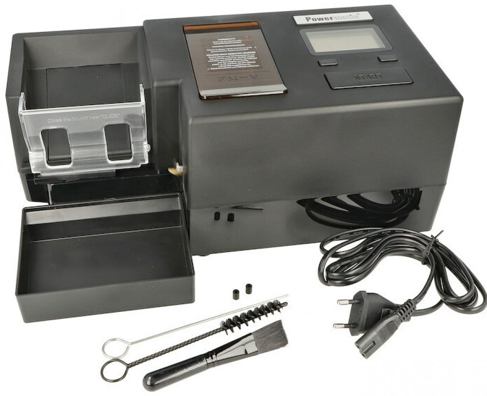 Automatická plnička cigaret Powermatic V umožňuje plnit dutinky nejen s automatickým podáváním dutinek, ale také jednotlivě po jednom kuse, kdy každou dutinku nasunete na trn manuálně. Pro plnění s automatickým podáváním dutinek je možné použít pouze dutinky velikosti King Size. Při plnění jednotlivých dutinek s manuálním podáváním můžete vyrábět nejen King Size, ale také 100 mm dlouhé cigarety (pro manuální plnění je nutné odklopit kryt zásobníku s dutinkami a dutinky na trn nasazovat ručně po jedné, stejné jako u předchozích typů plničky Powermatic II, III nebo IV). Ovládání je jednoduché, komoru pro tabák naplníte Vašim oblíbeným tabákem určeným pro plnění dutinek, naplníte zásobník pro dutinky a zmáčkněte Start. Během pár vteřin máte vyrobenou cigaretu, která spadne do odnímatelného zásobníku. Pro naplnění další dutinky znova stiskněte Start.